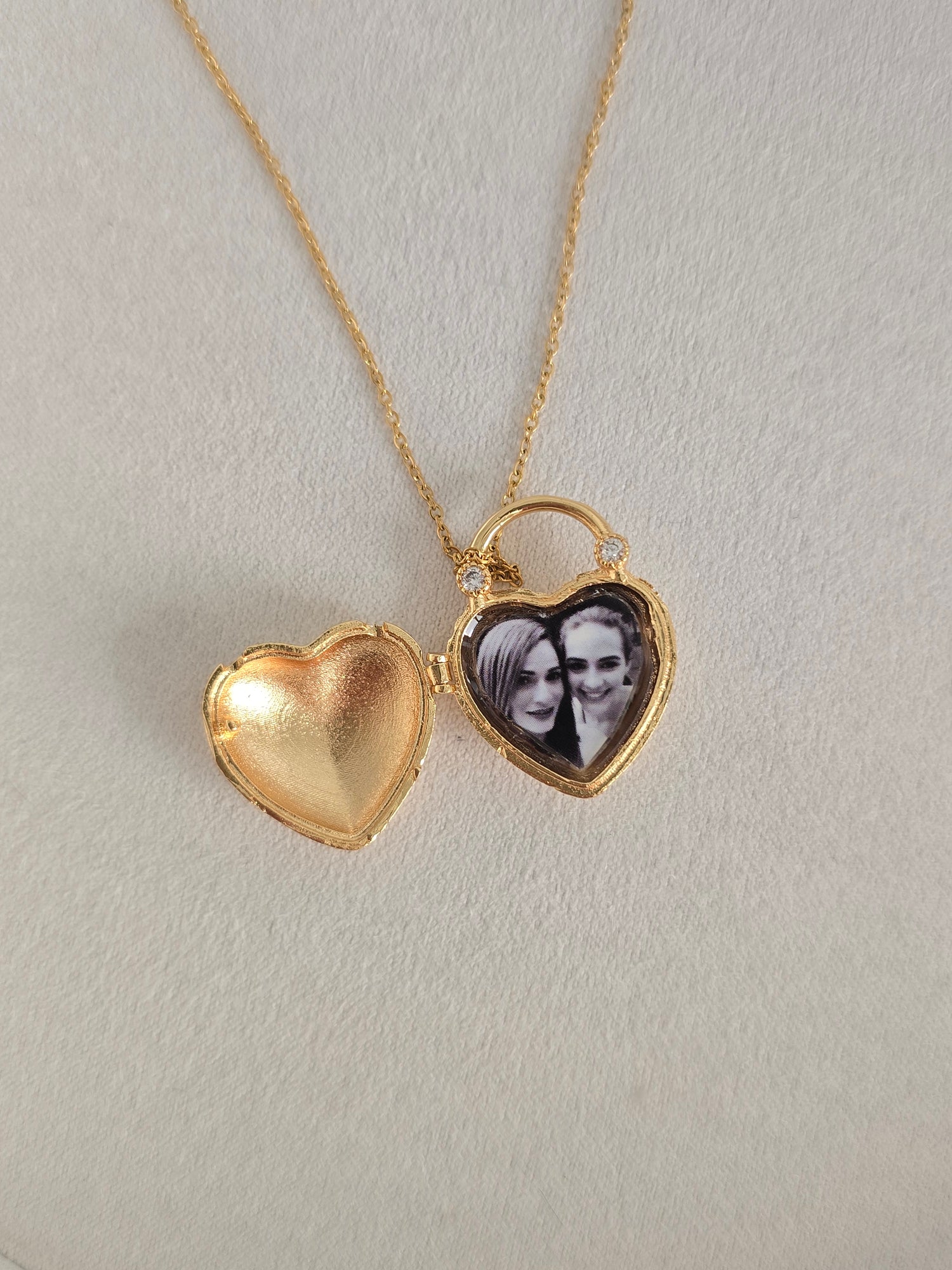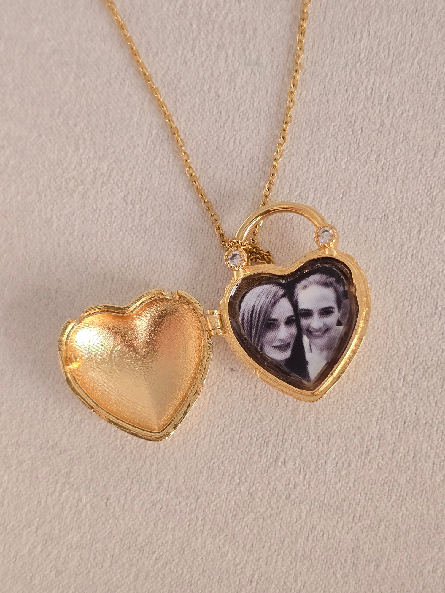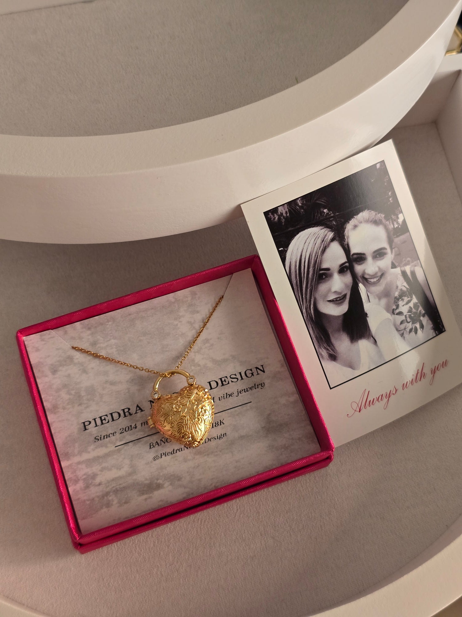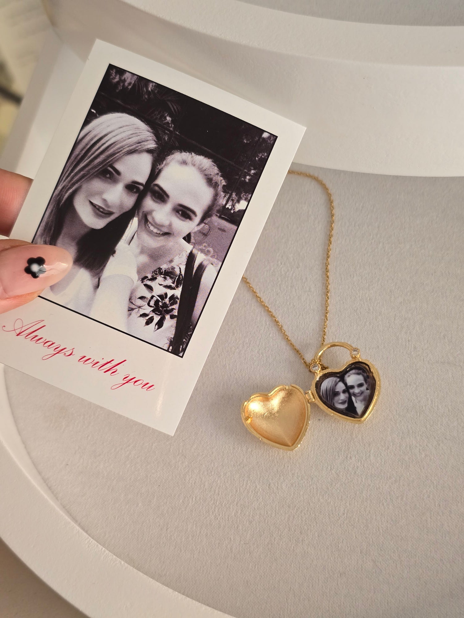 Incluye: 1 foto mini dentro del relicario , 1 foto impresa tipo polaroid , cadena , relicario y estuche .