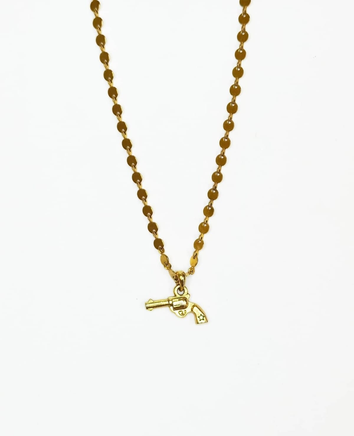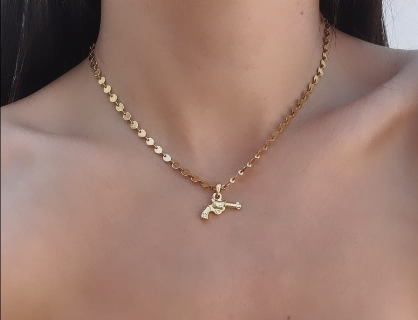 Gargantilla cadena lunares con pistola colgante, la pistola tiene el detalle de una estrella grabada en la empuñadura y recuerda si vas a disparar dispara chescos :) , cuenta extensión para ajustar la medida de tu collar.