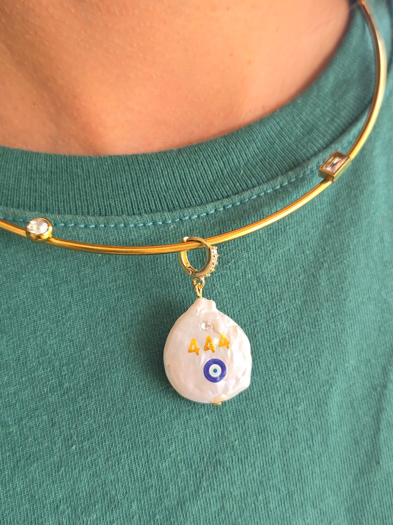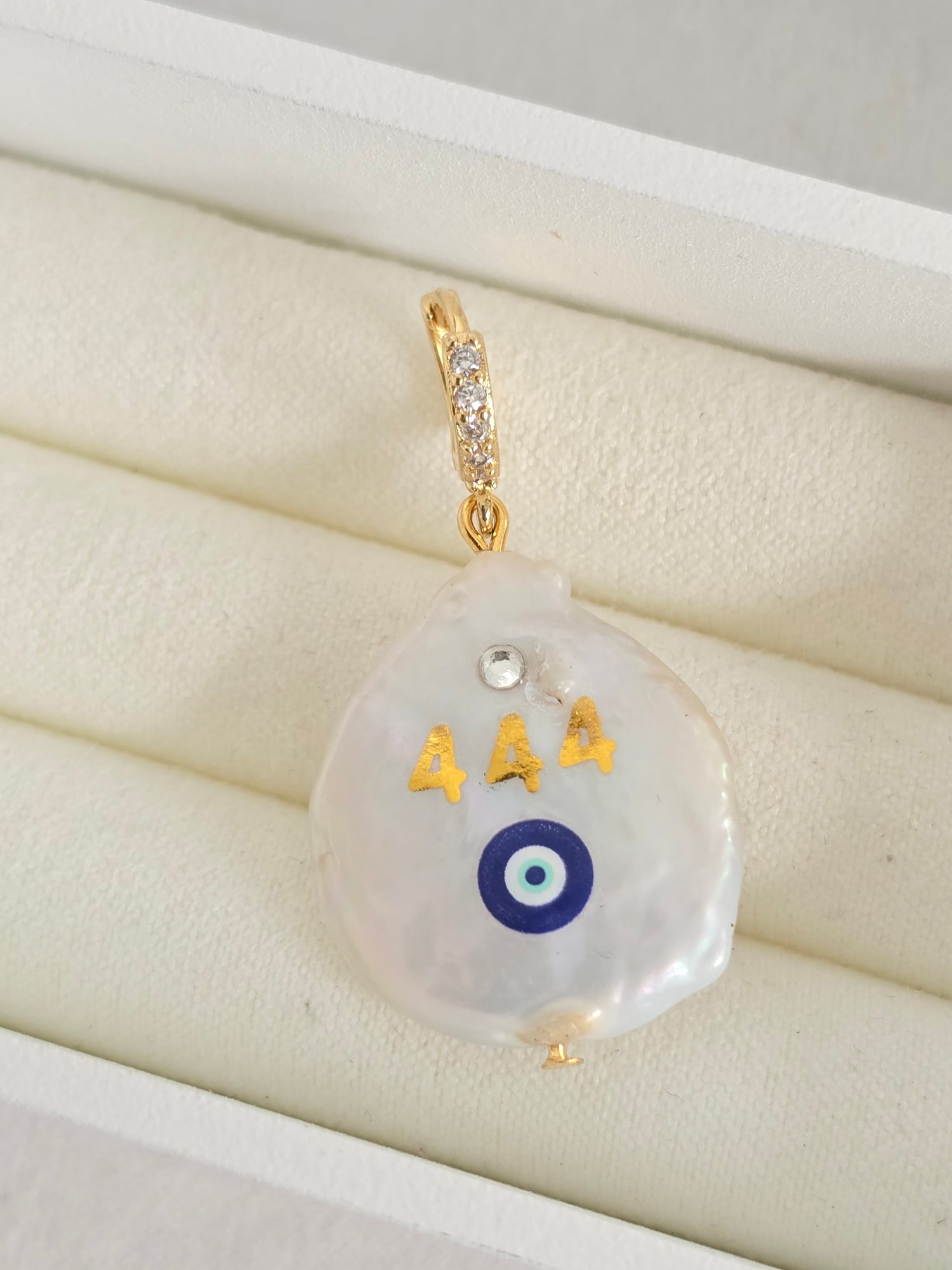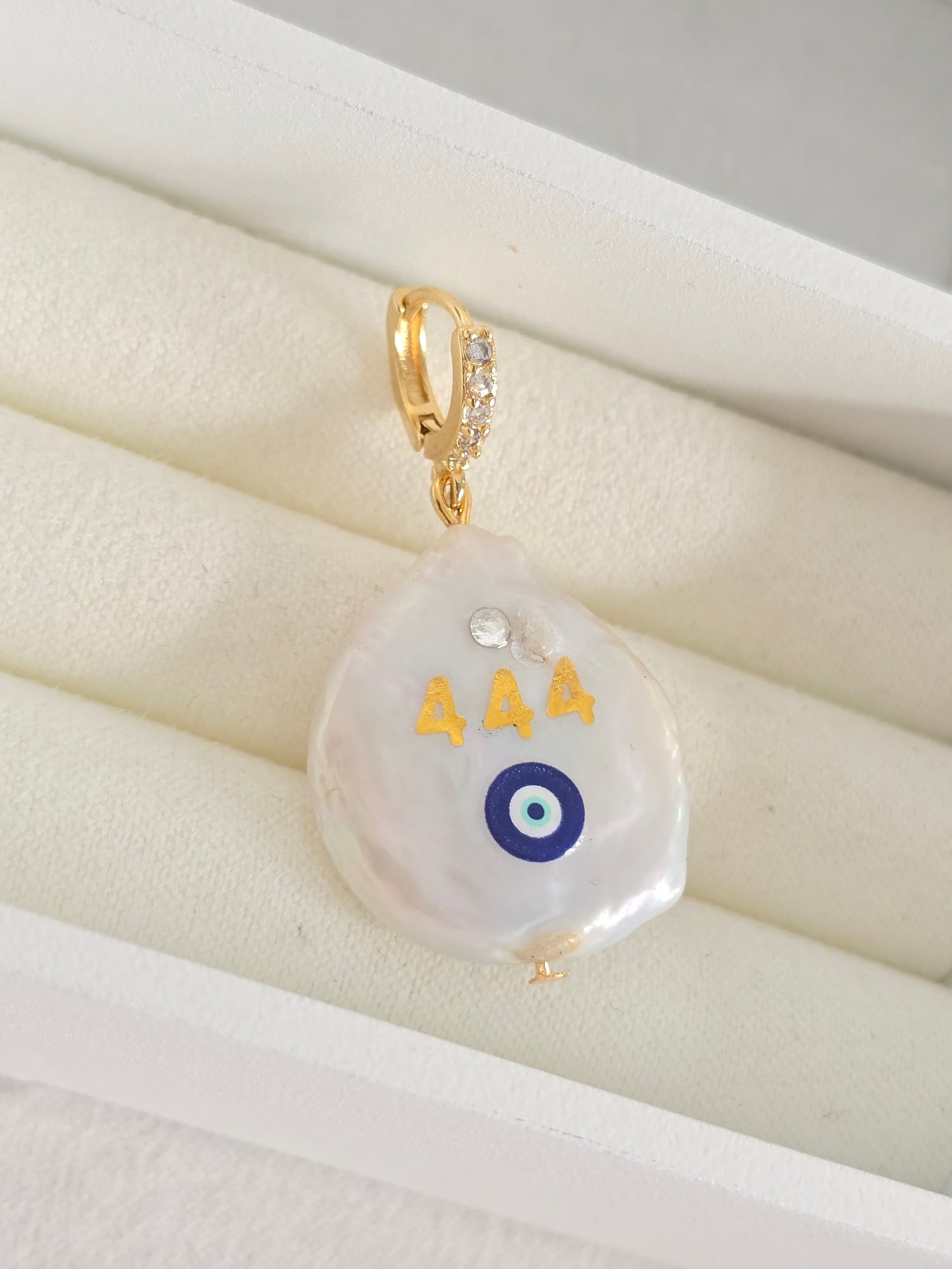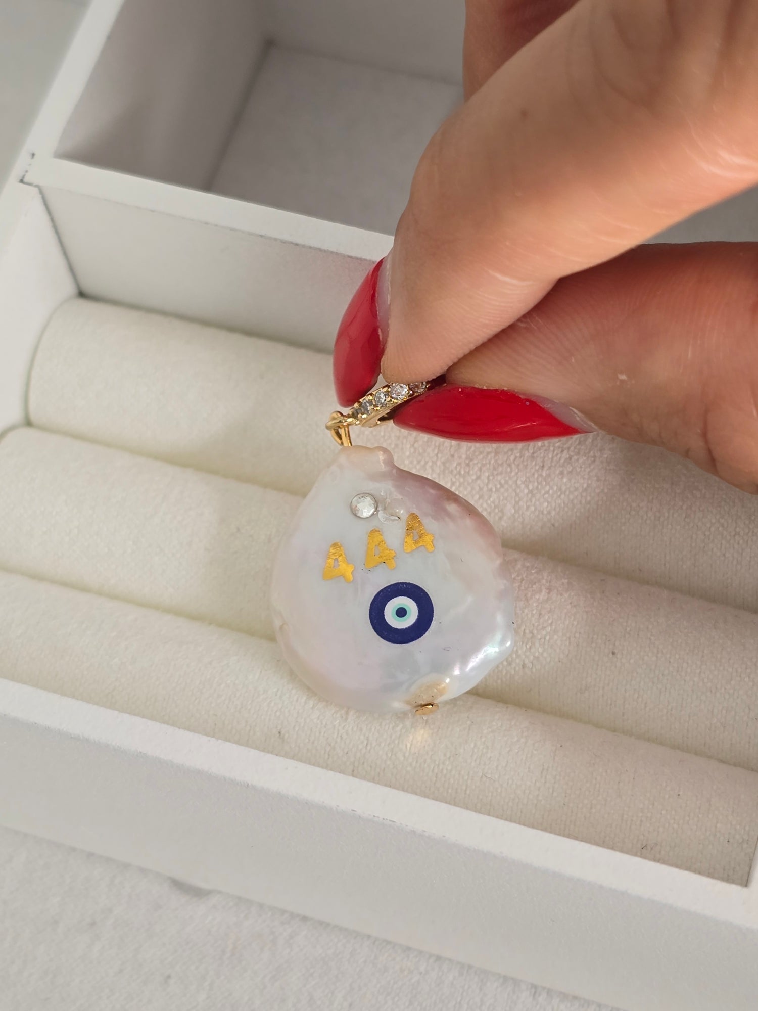 Charm de perla calabazon cultivada intervenida con el angel number 777 y ojito turno que serán tu amuleto favorito para estar bien protegid@ contra el mal de ojo , pura buena vibra aquí 😊 !