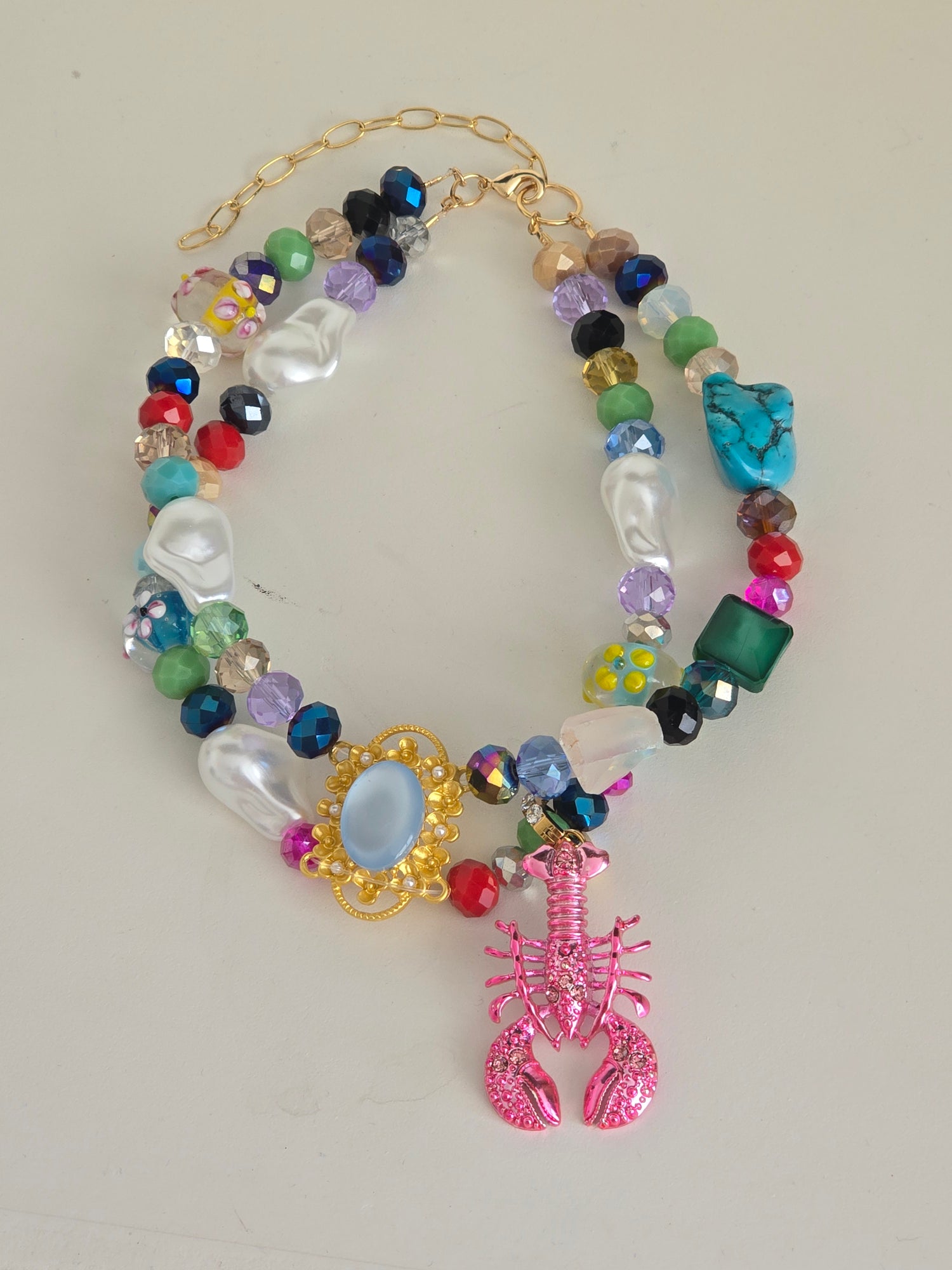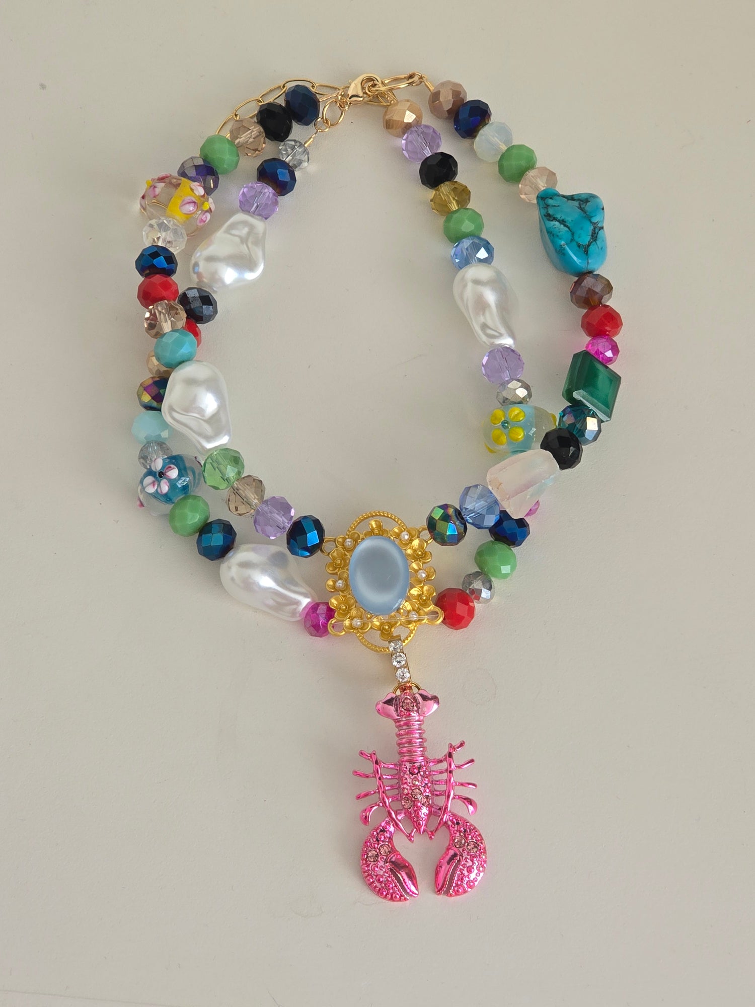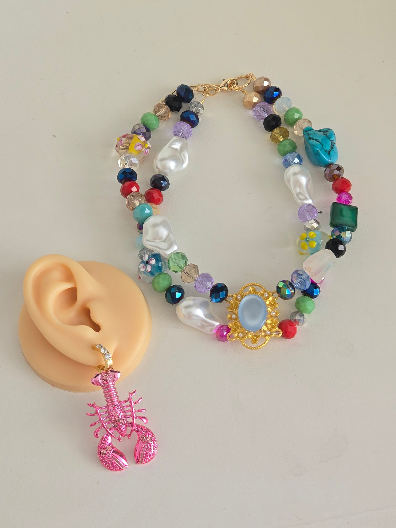 Arma increíbles outfits con esta bellezita colorida ! , choker mix doble con langosta rosa que puedes usar también de arete o mover los de lugar en tu collar para armar diferentes looks (ya sabes que aquí le sacamos jugo a todo 😉)