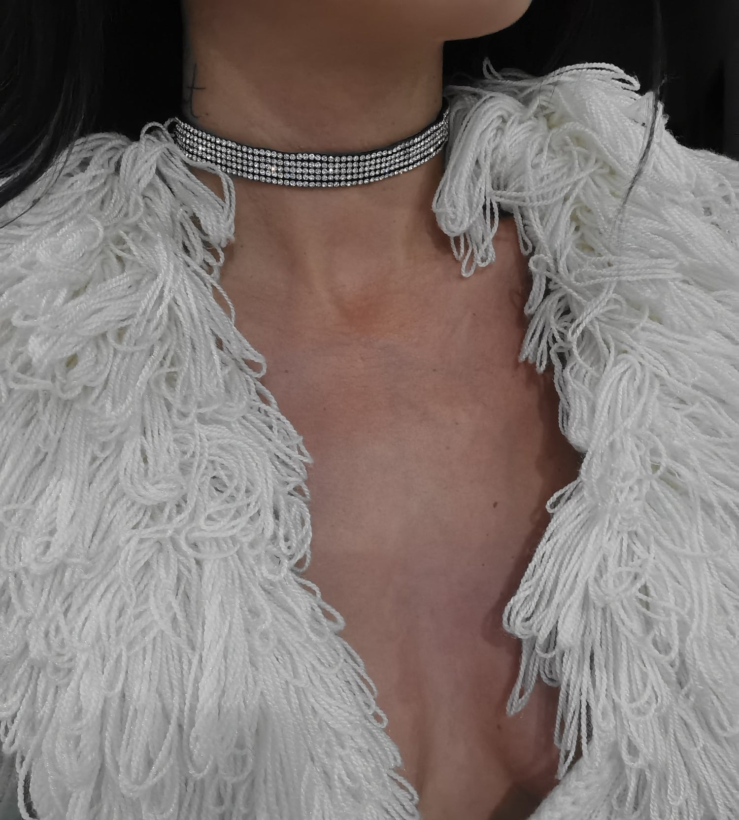 Choker de brillos delgado unitalla , lo ajustas con un moñito así que queda en cualquier grosor de cuello :)