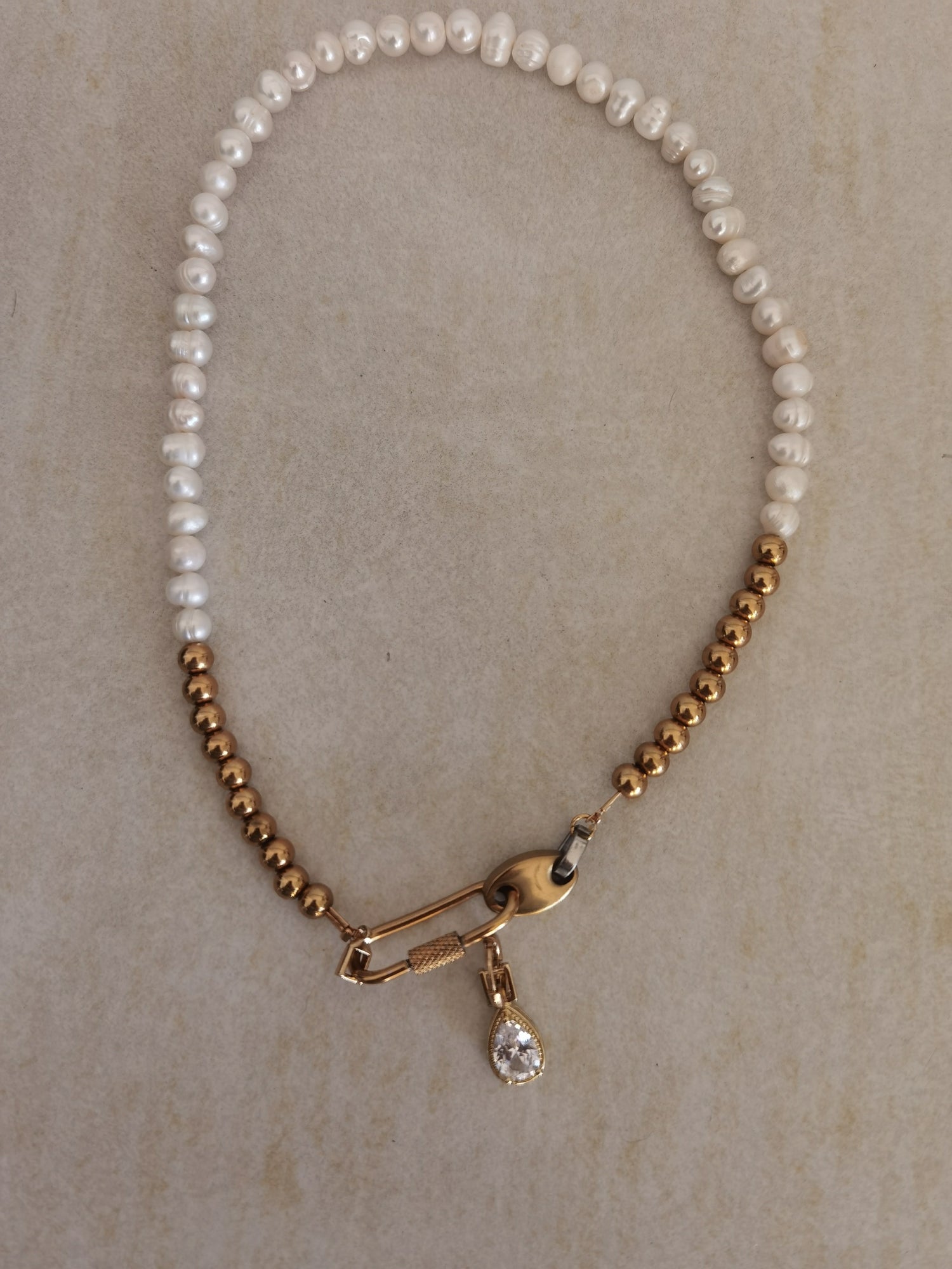 Collar mix entre perlas cultivadas, bolitas doradas y zirconia en gota la cual puedes usar de colgante en el collar o también de arete