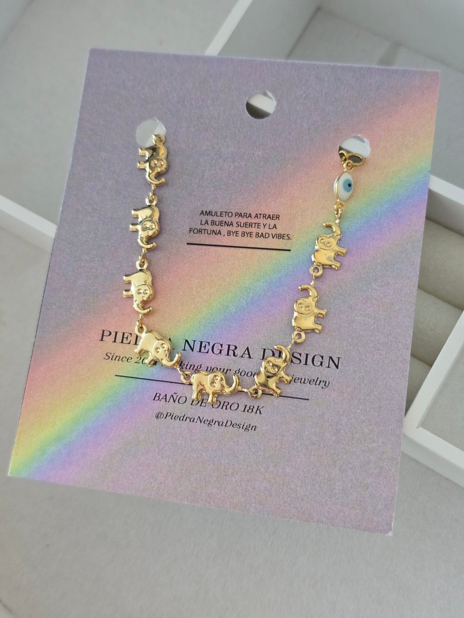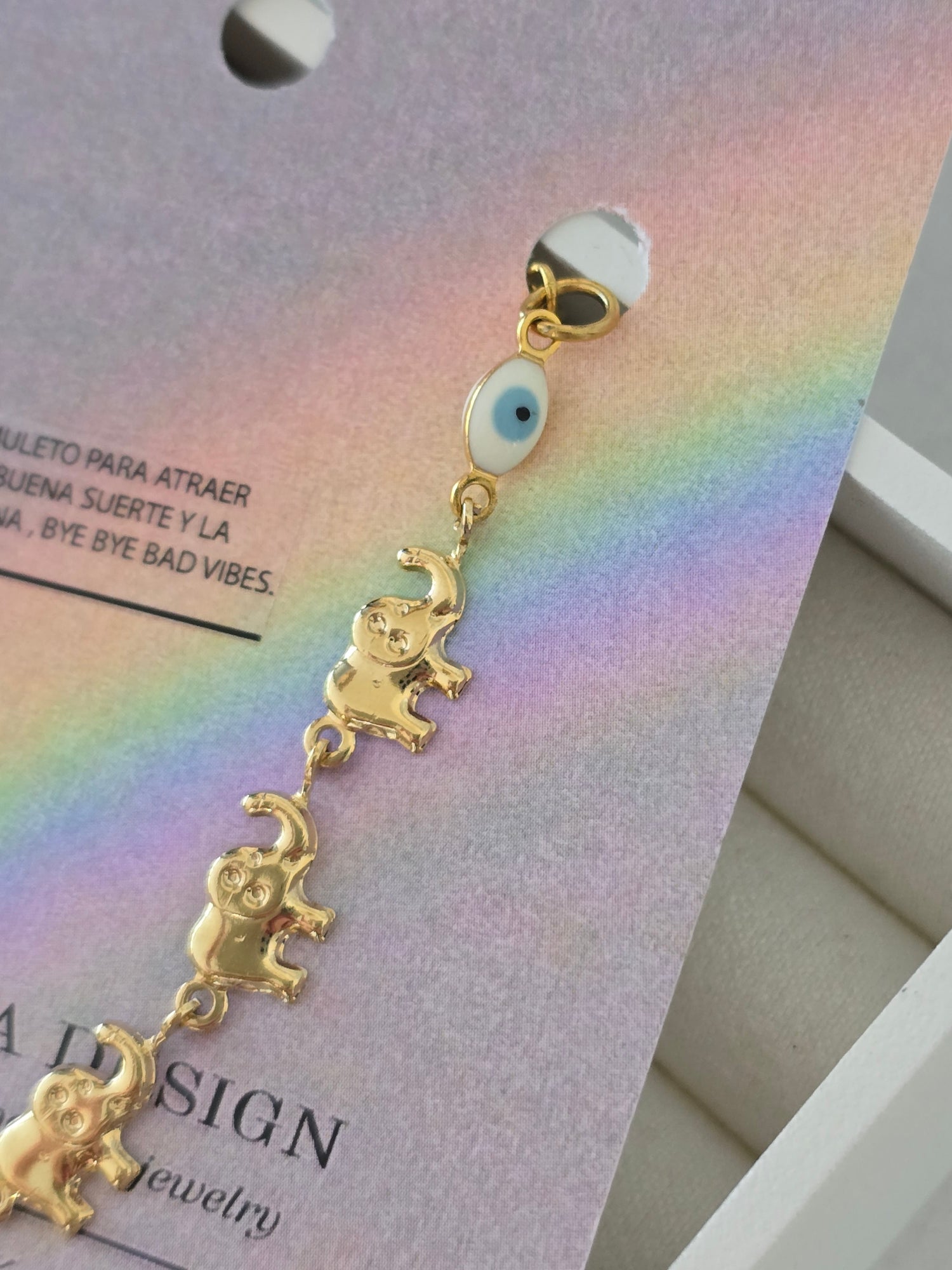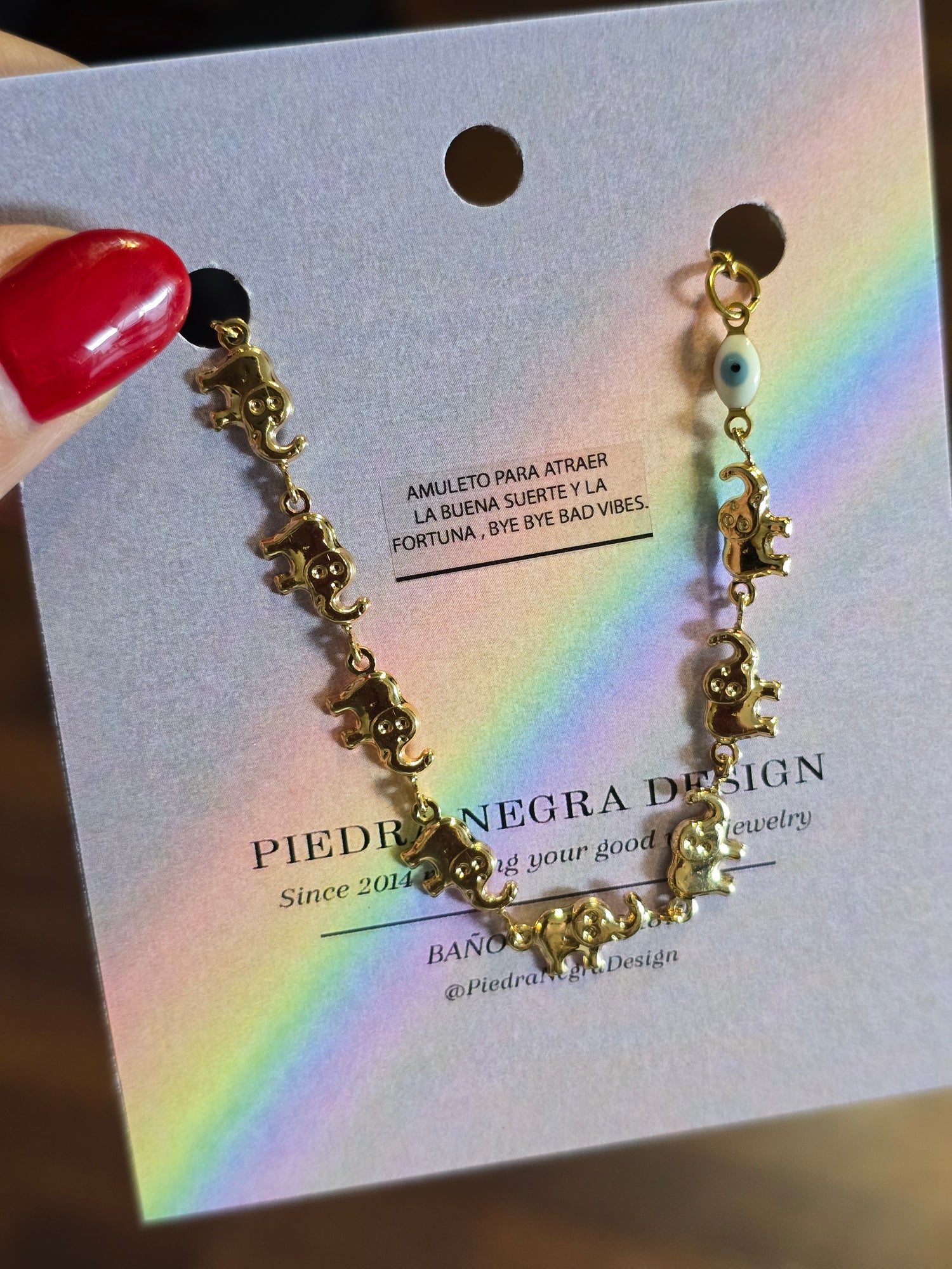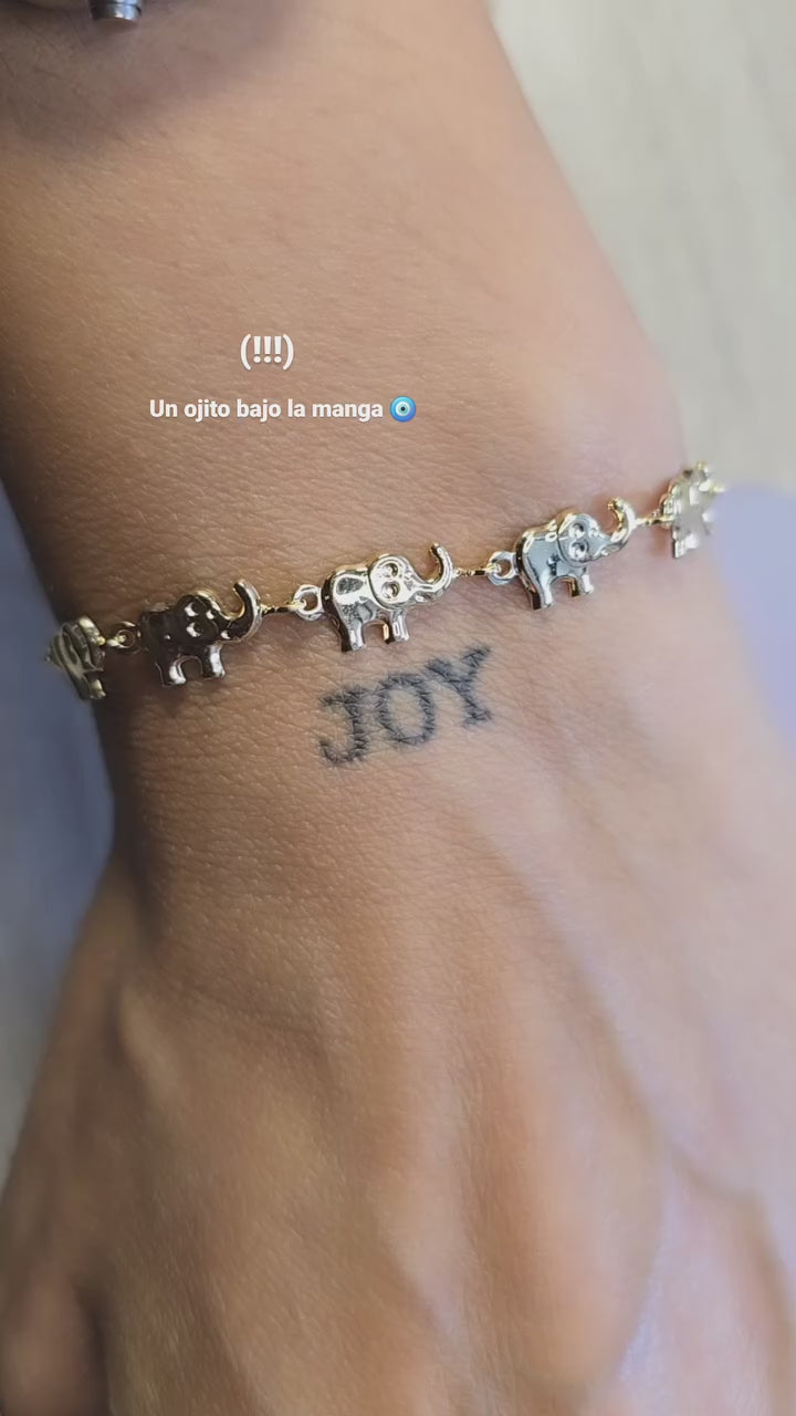 Este brazalete tiene un secreto y es que esconde un ojo bajo la manga, el ojo que cuidará de ti y los tuyos ! Los elefantes representas a tus seres más queridos , que su unión sea eterna !