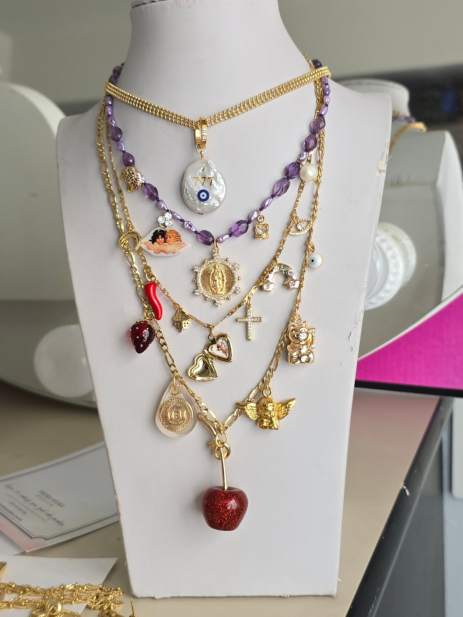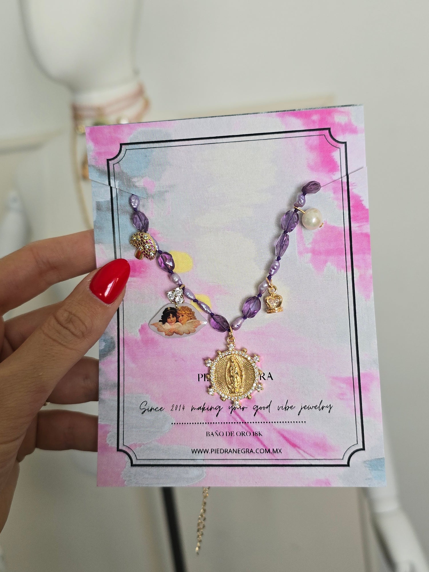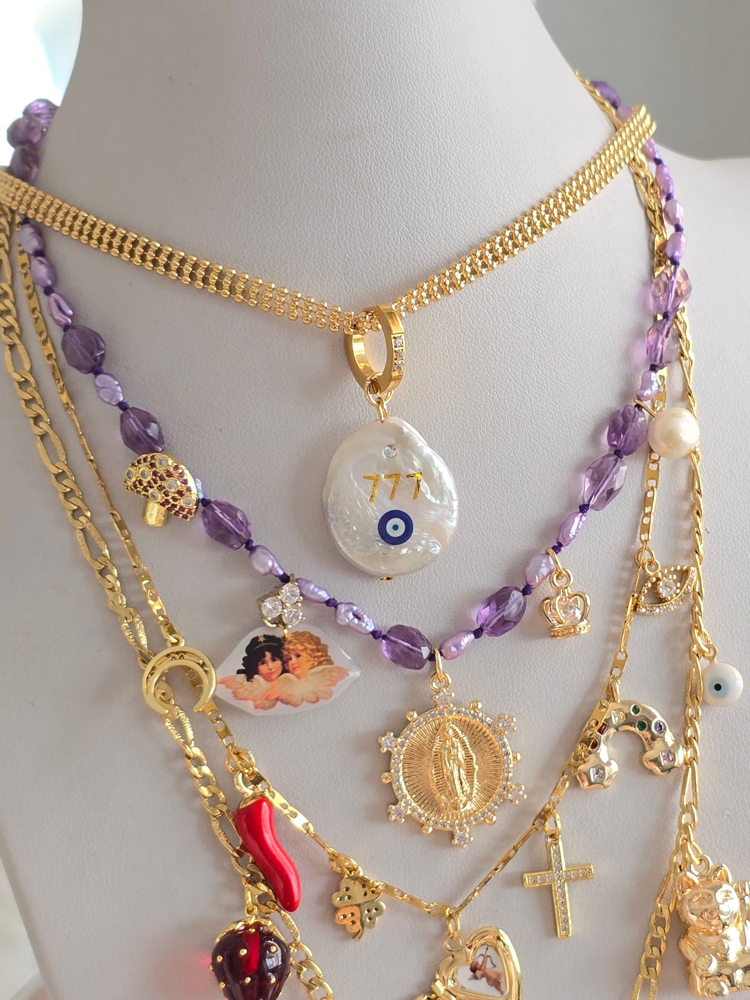 Collar de perlas cultivadas y cuarzos amatistas naturales que brillan hermosoooo, con los charms que te recuerdan que te cuidan desde arriba 24/7 👼🏼💕