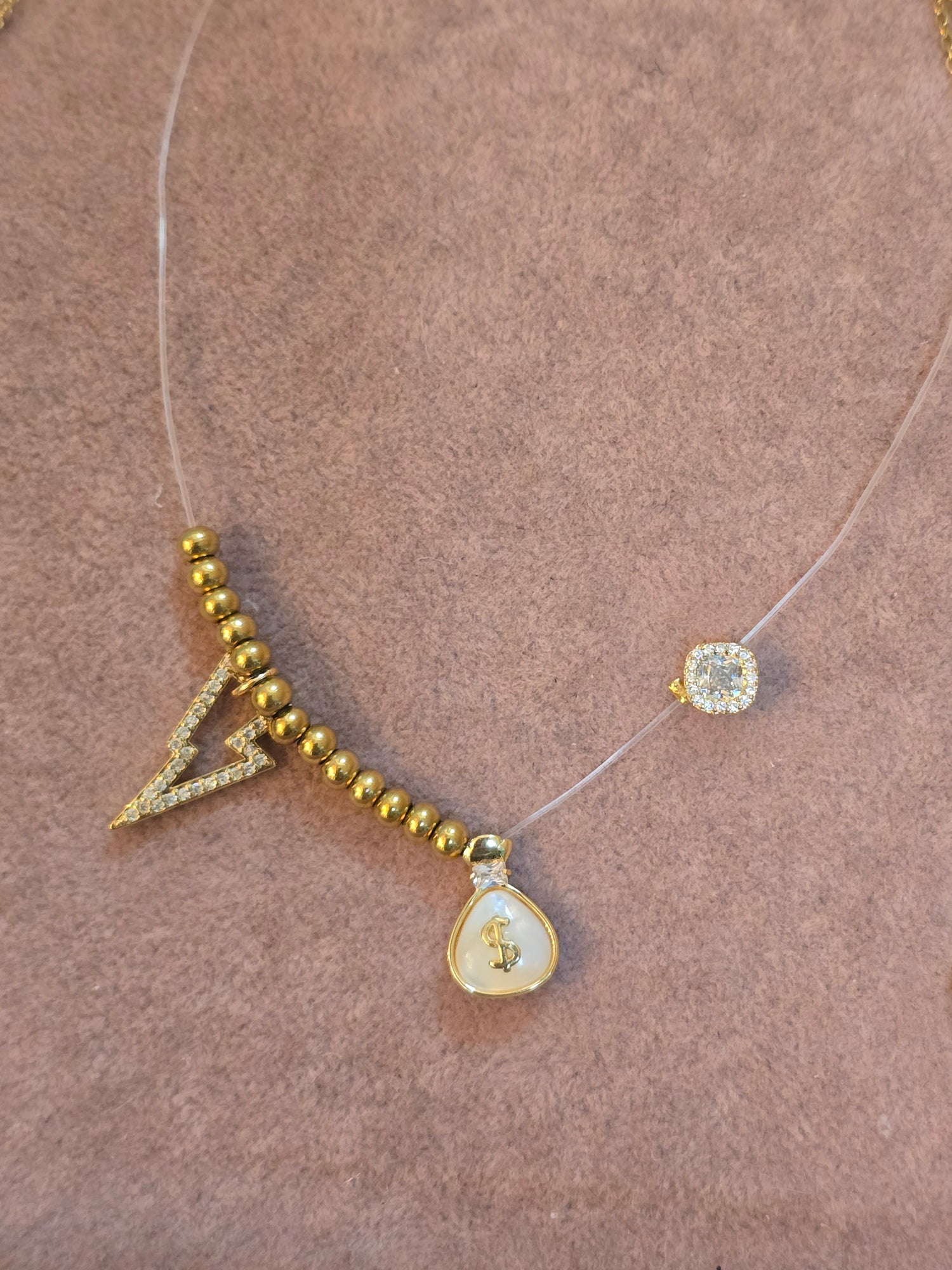 Collar transparente con costal MONEY HONEY de madre perla que será tu amuleto de atracción para que todo eso que sueñas lo materialices y se haga realidad !
