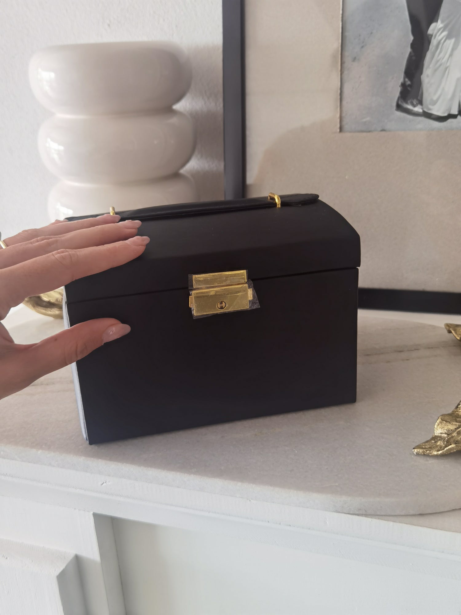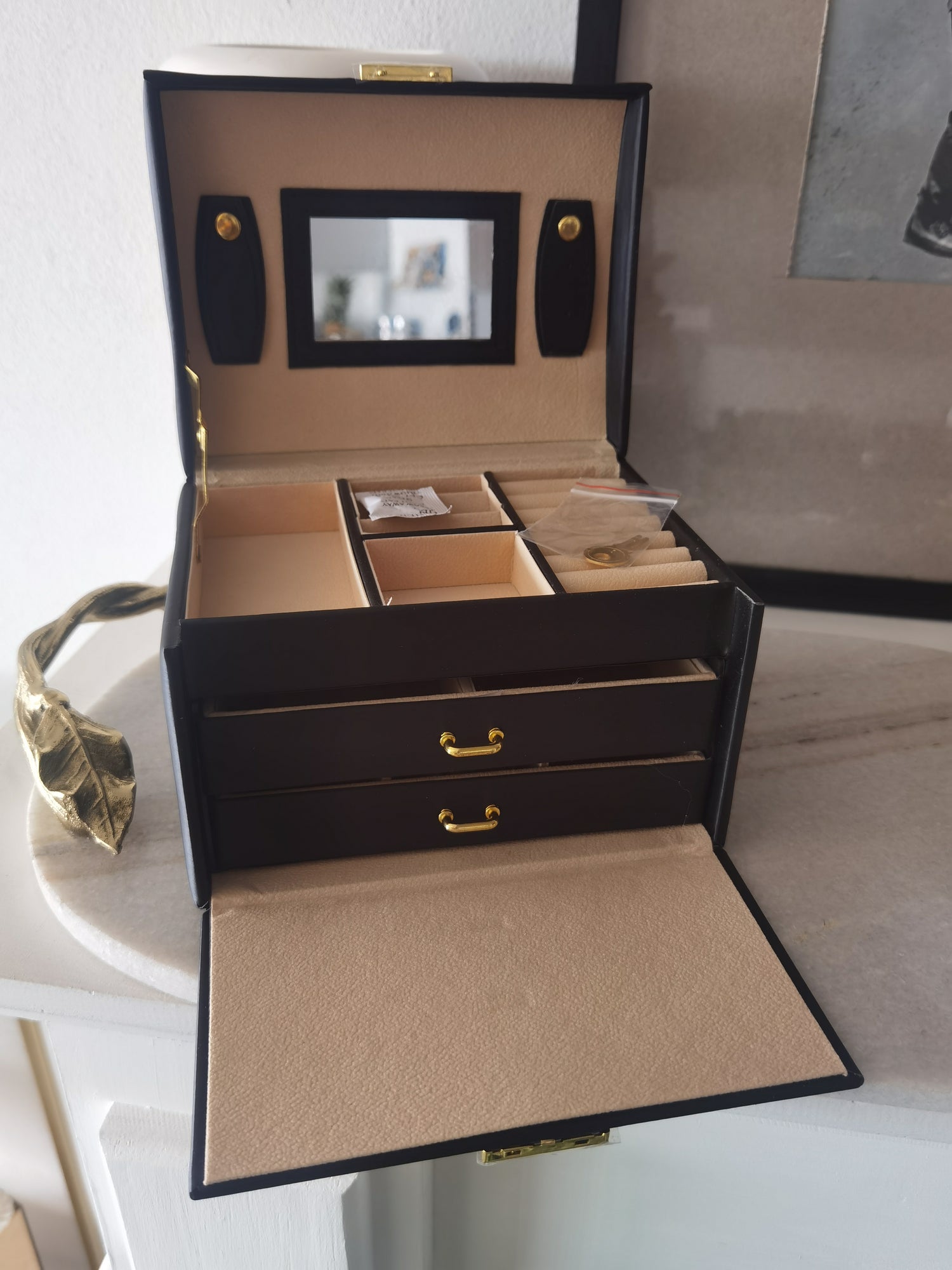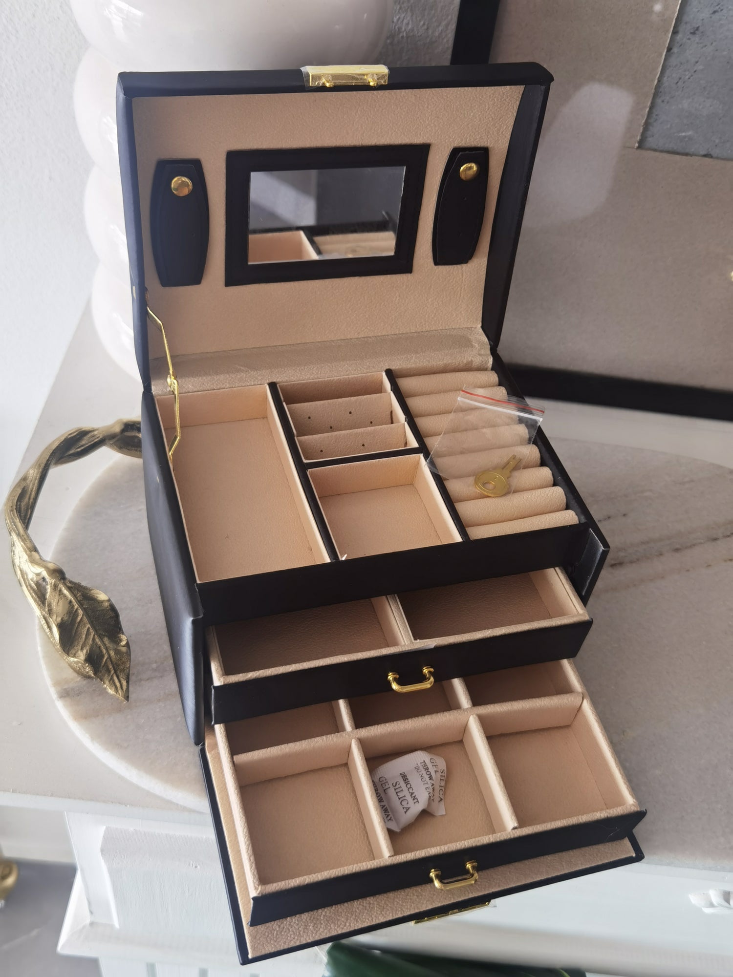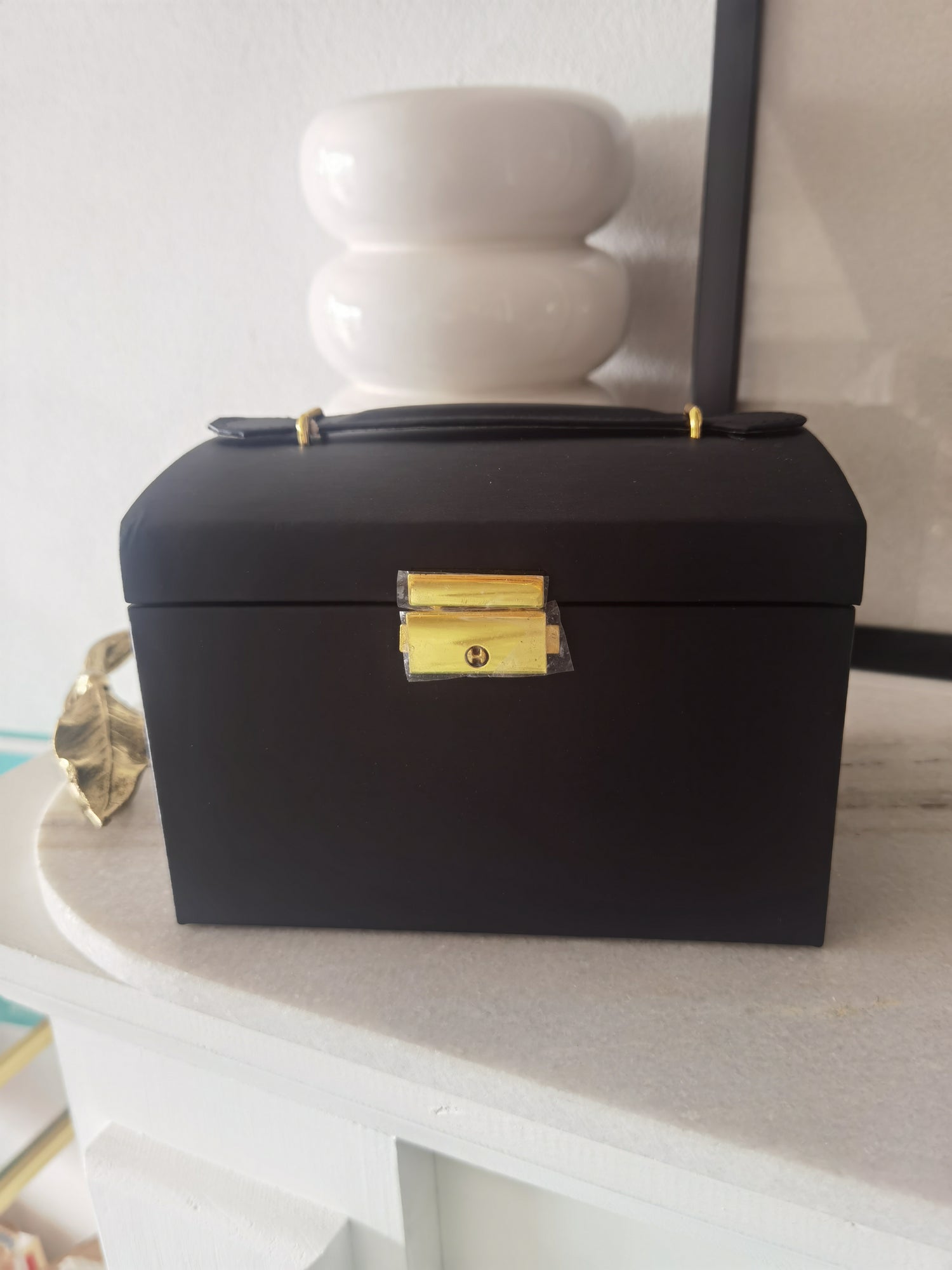 Joyero ideal para un viaje largo , ya que le caben muchos accesorios y por su cantidad de compartimientos te permite acomodarlos de distintas maneras dependiendo los accesorios que tengas , también se verá hermoso en tu buró o en tu mesa de make up 🙂