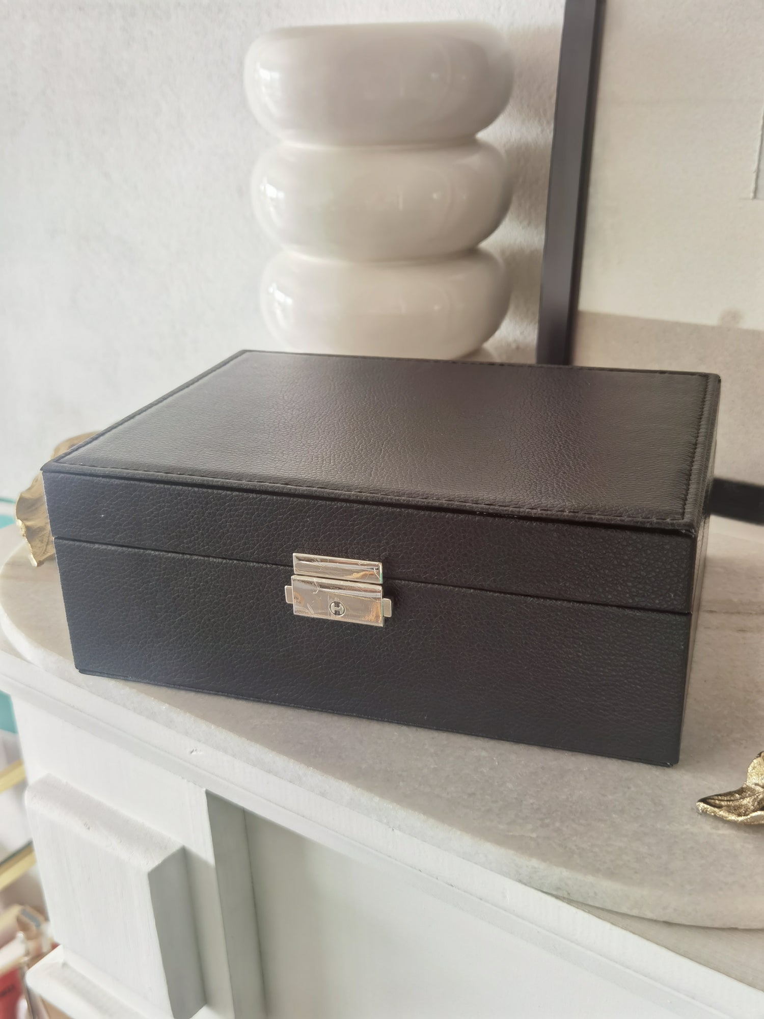El joyero más grande que tenemos, cuenta con protección de llave para que solo tu puedas ver tus joyitas , es ideal para acomodarlo en tu buró o en tu mesa de make up ya que su textura de vini piel negra le da un toque súper elegante .
