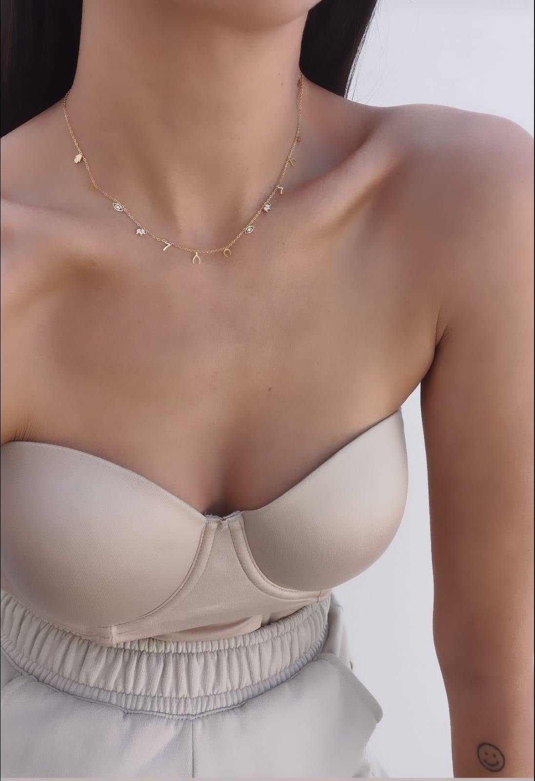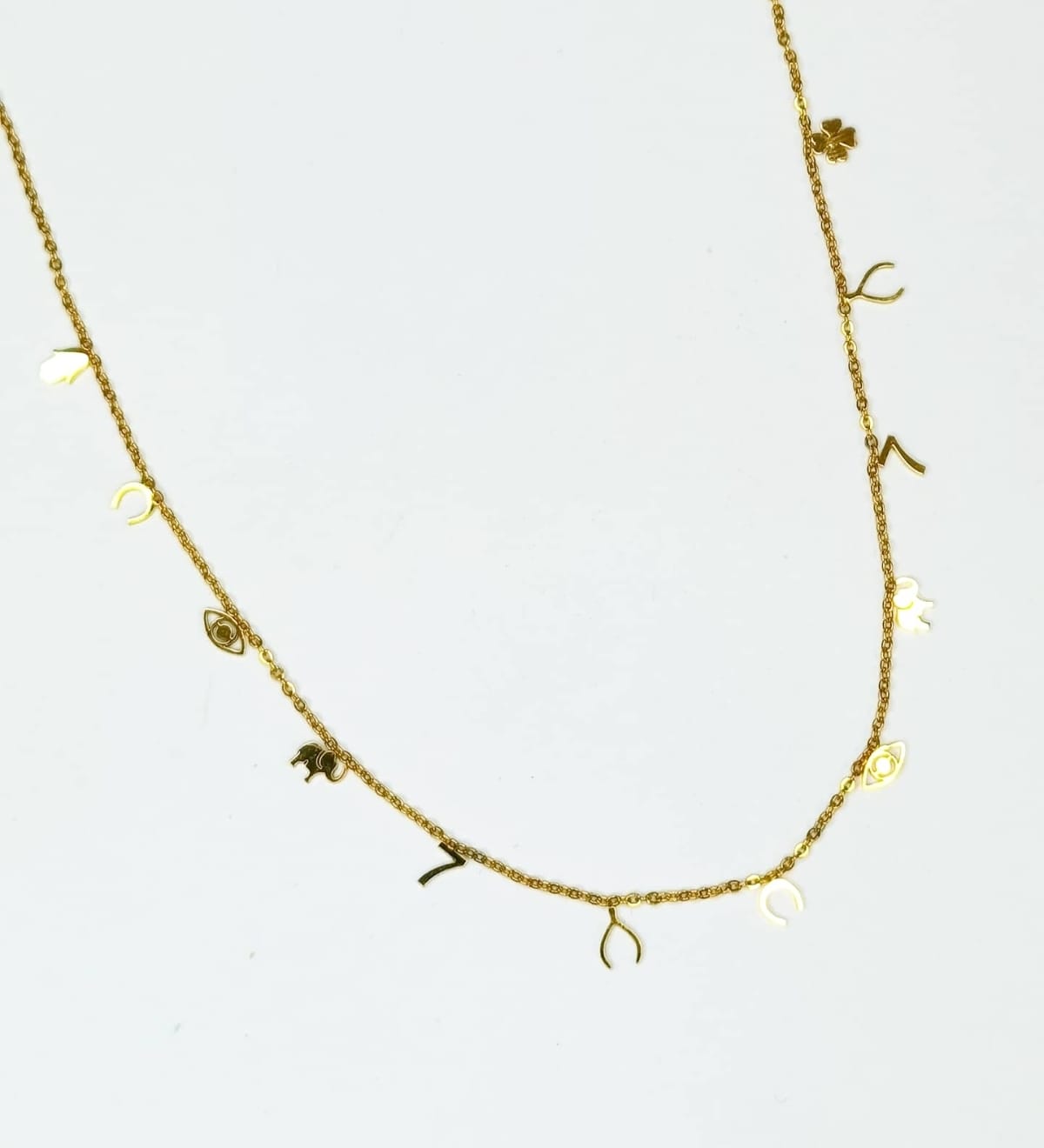 Gargantilla con mini charms que se encargaran de protegerte contra todo mal.