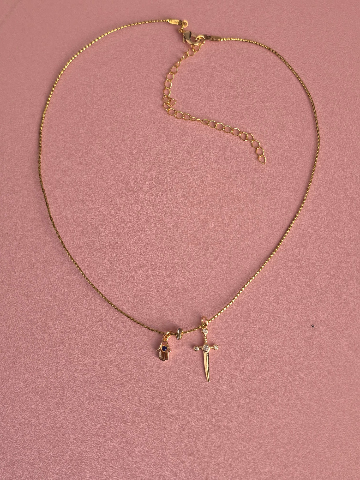 La mano de Hamsa o también conocida como la mano de Fátima es un símbolo de protección, bendiciones divinas, fuerza y buena fortuna. También es un emblema de tolerancia, unidad y comprensión, en esta ocasión la juntamos con la espada que es símbolo de valentía, así que usa este collar para sentirte protegida y animarte a dar esos pasos que siempre haz querido y no te atreves .