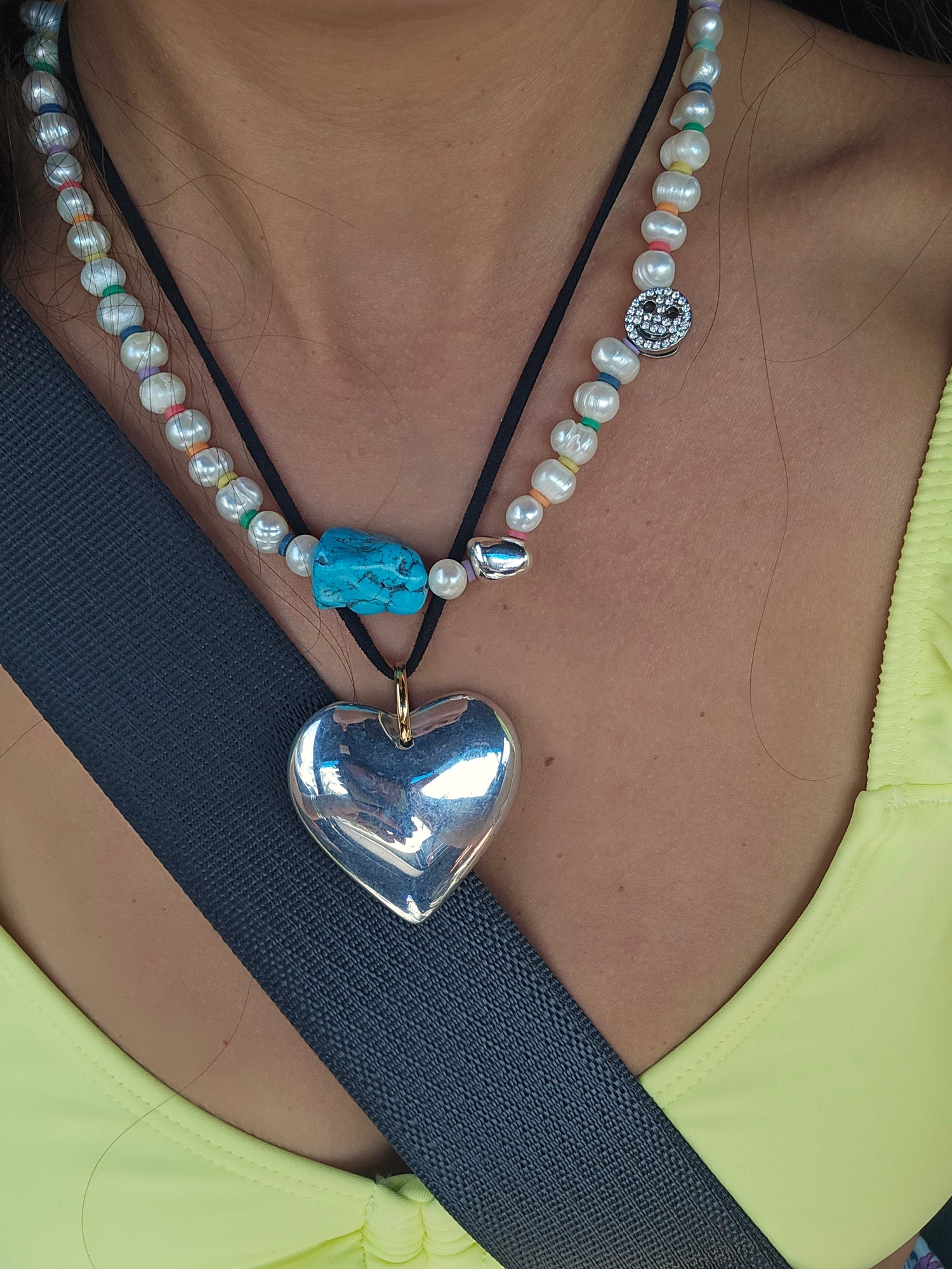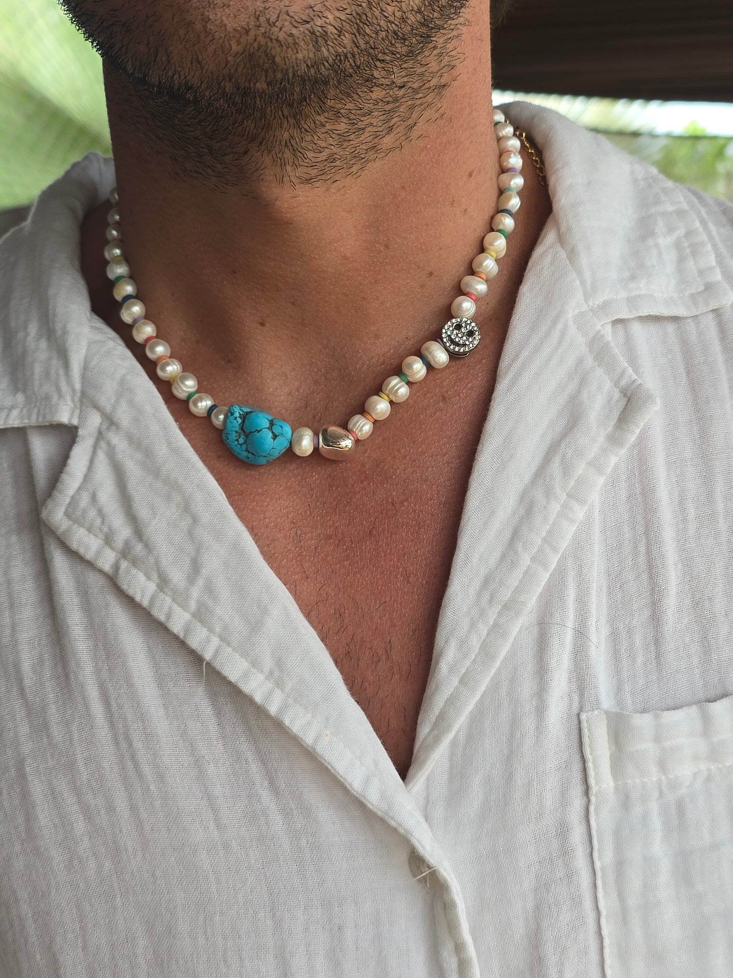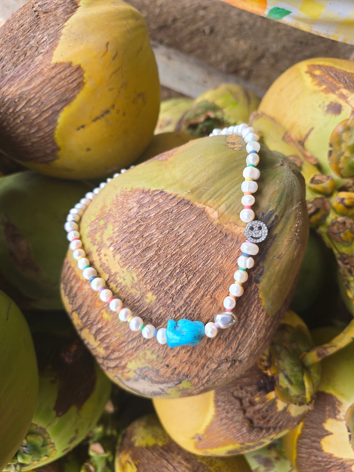 Las perlitas cultivadas más felices del condado ! Disfruta de este collar alegre lleno de buenas vibras, con su turquesa central que lo hace una pieza excepcional!
