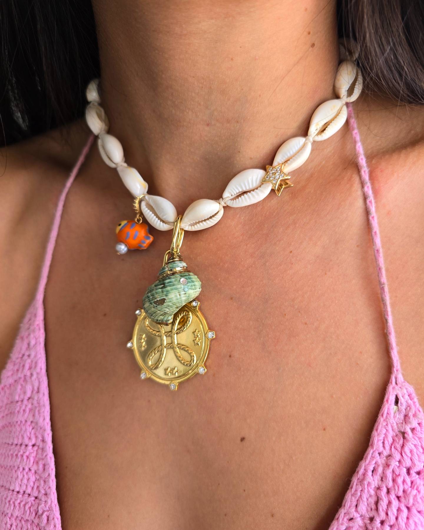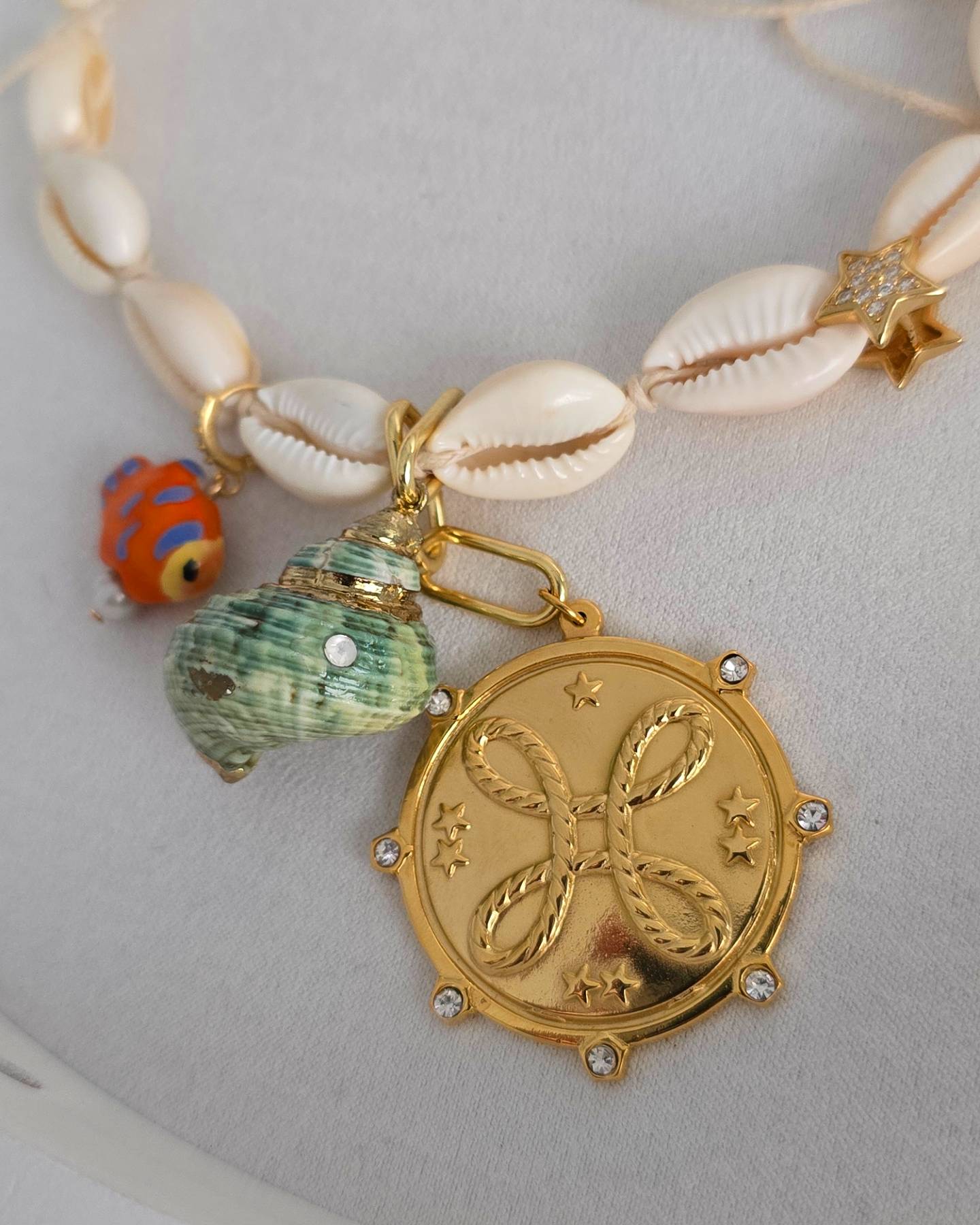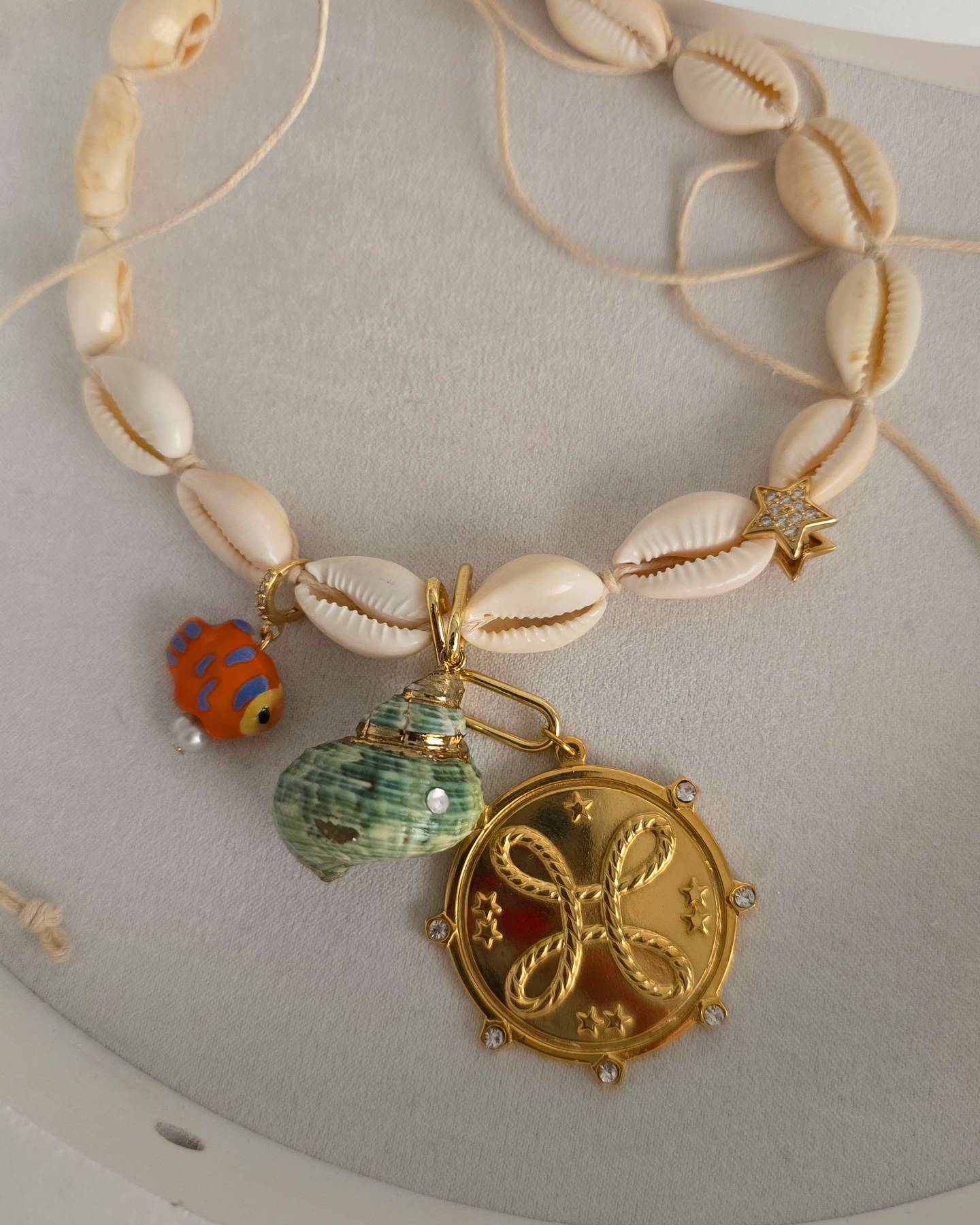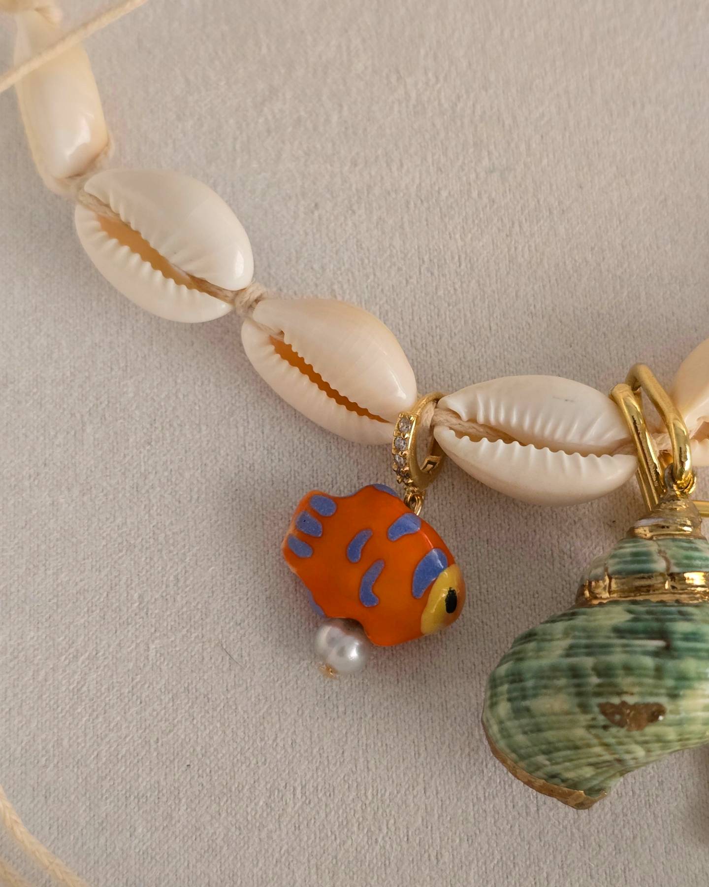 Material: conchitas con moneda de acero bañado en oro 18K y zirconias, pez de cerámica pintada