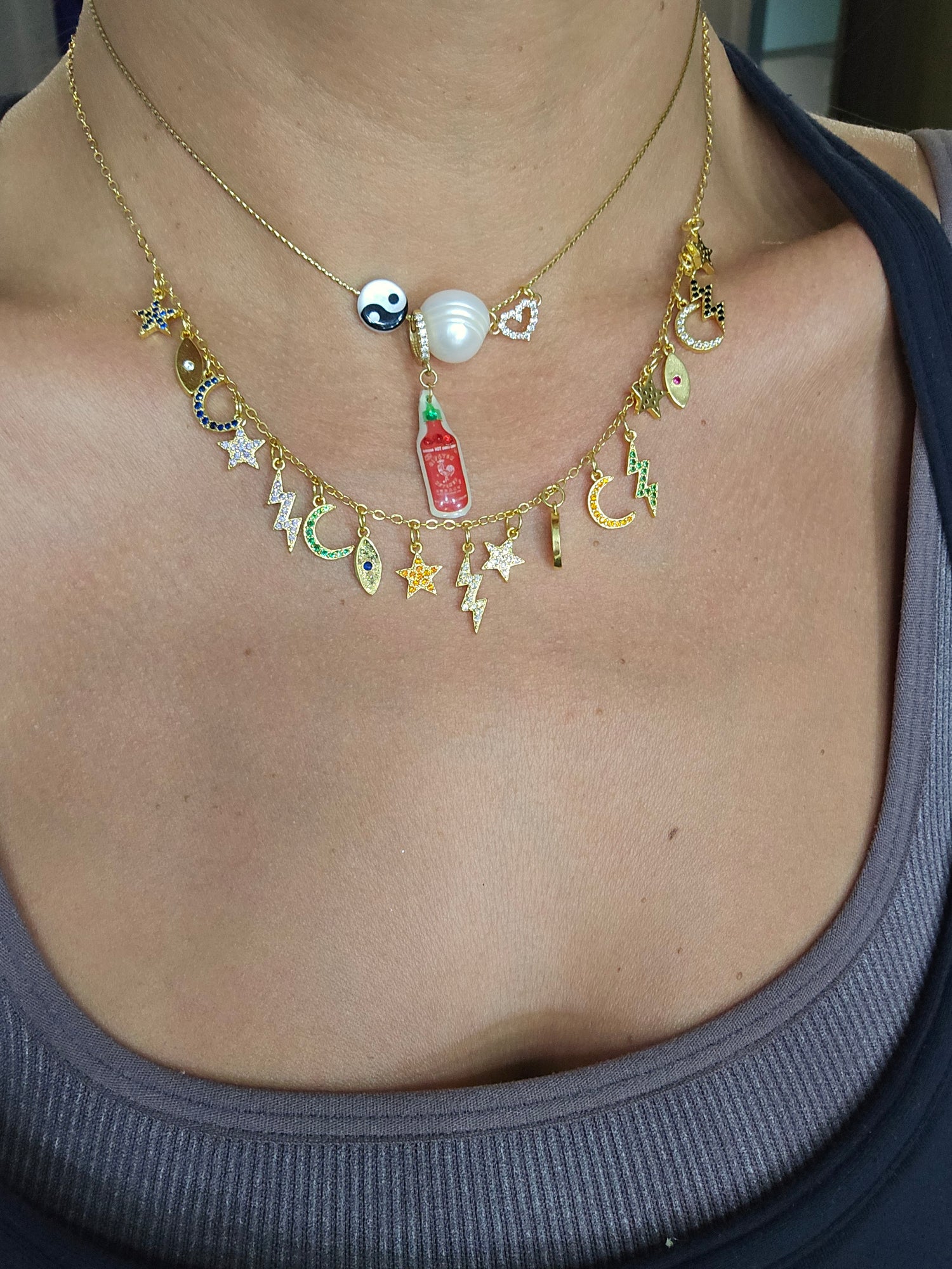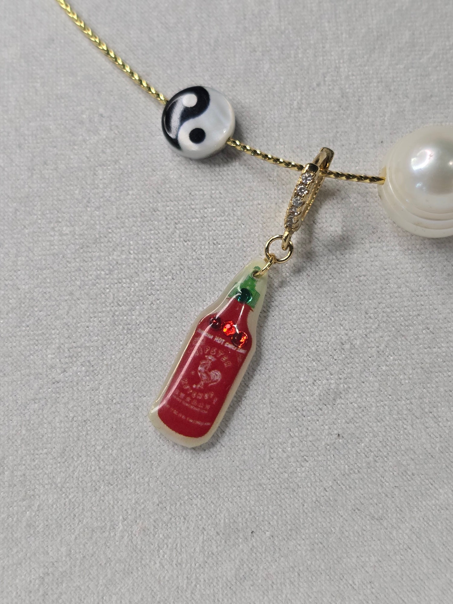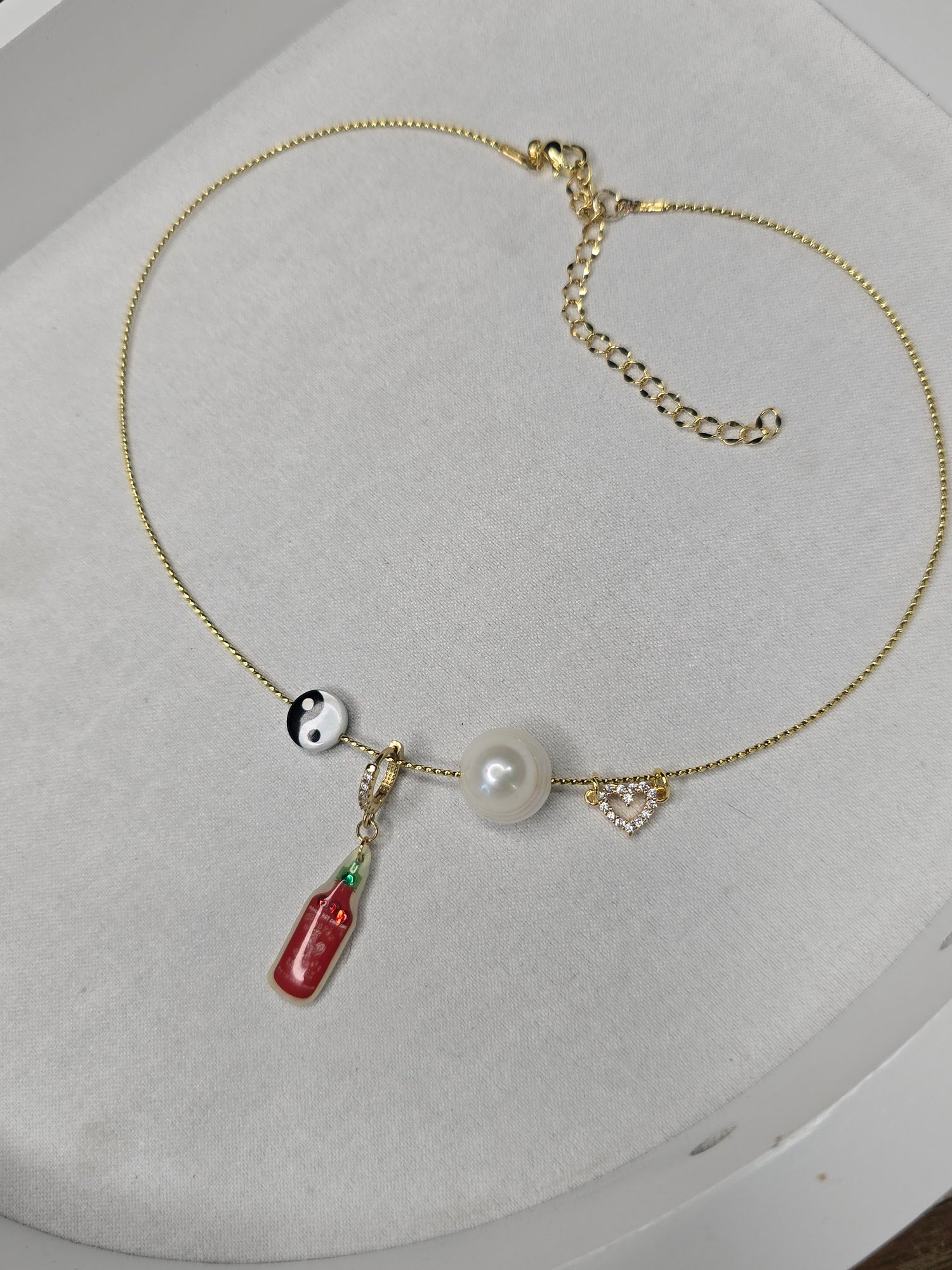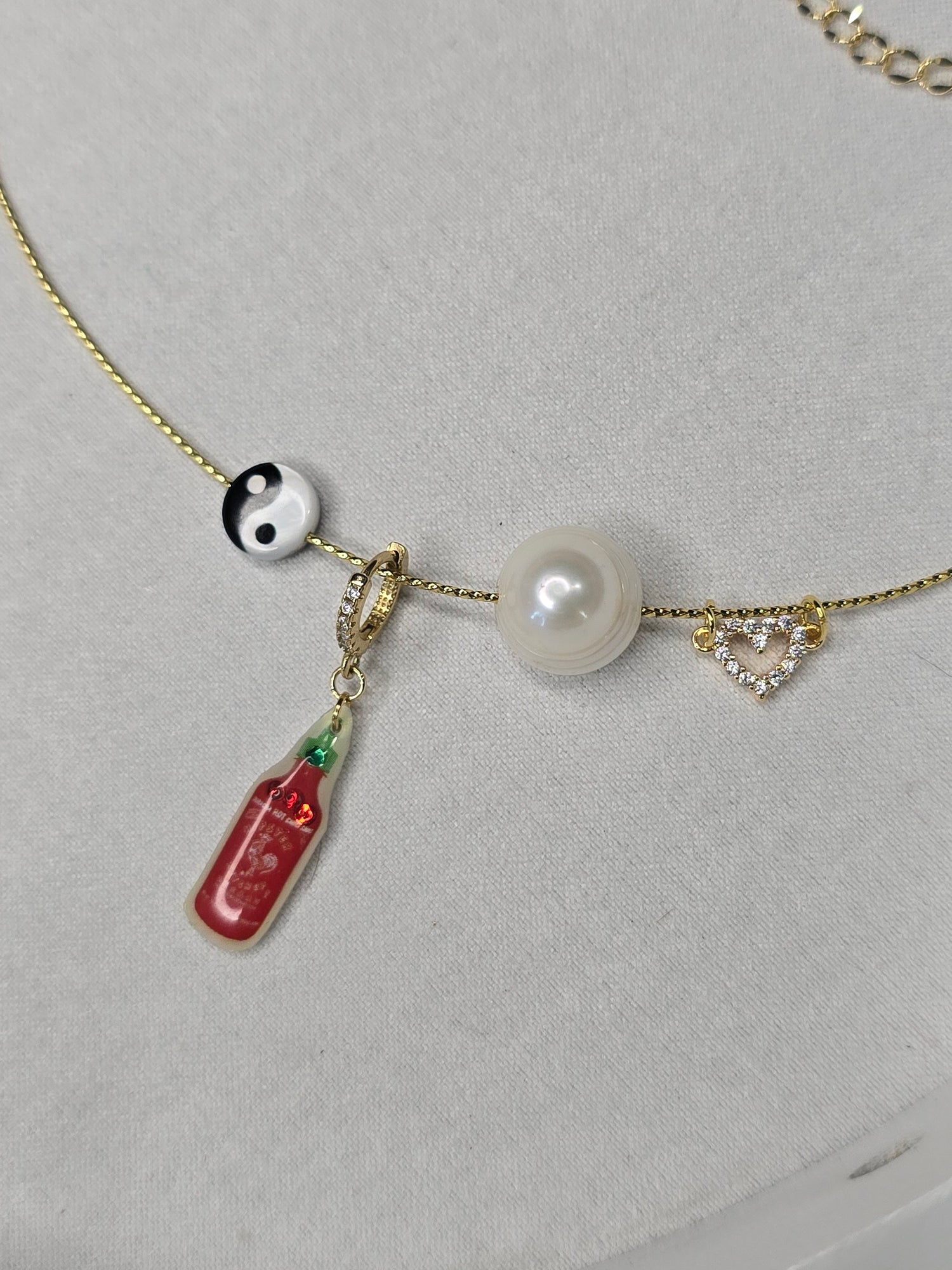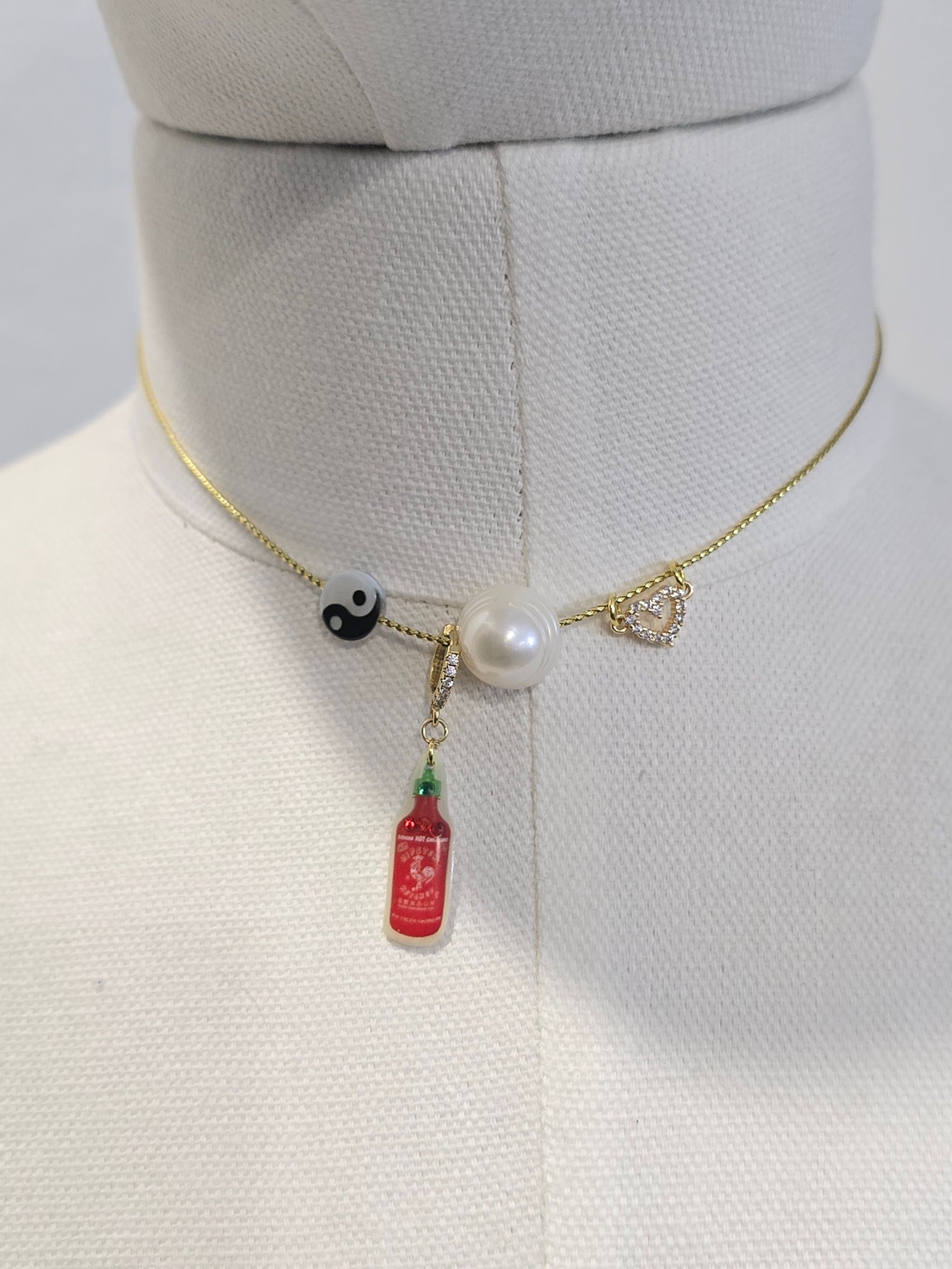Un choker súper lindo ya que el tamaño de sus mini charms lo hace ver super finito, la perla cultivada le da el toque elegante , la parte cool se la da la salsa sriracha y sobre todo diferente a lo que estamos acostumbrados a ver :) (usa tu salsa sriracha de arete o de charm )