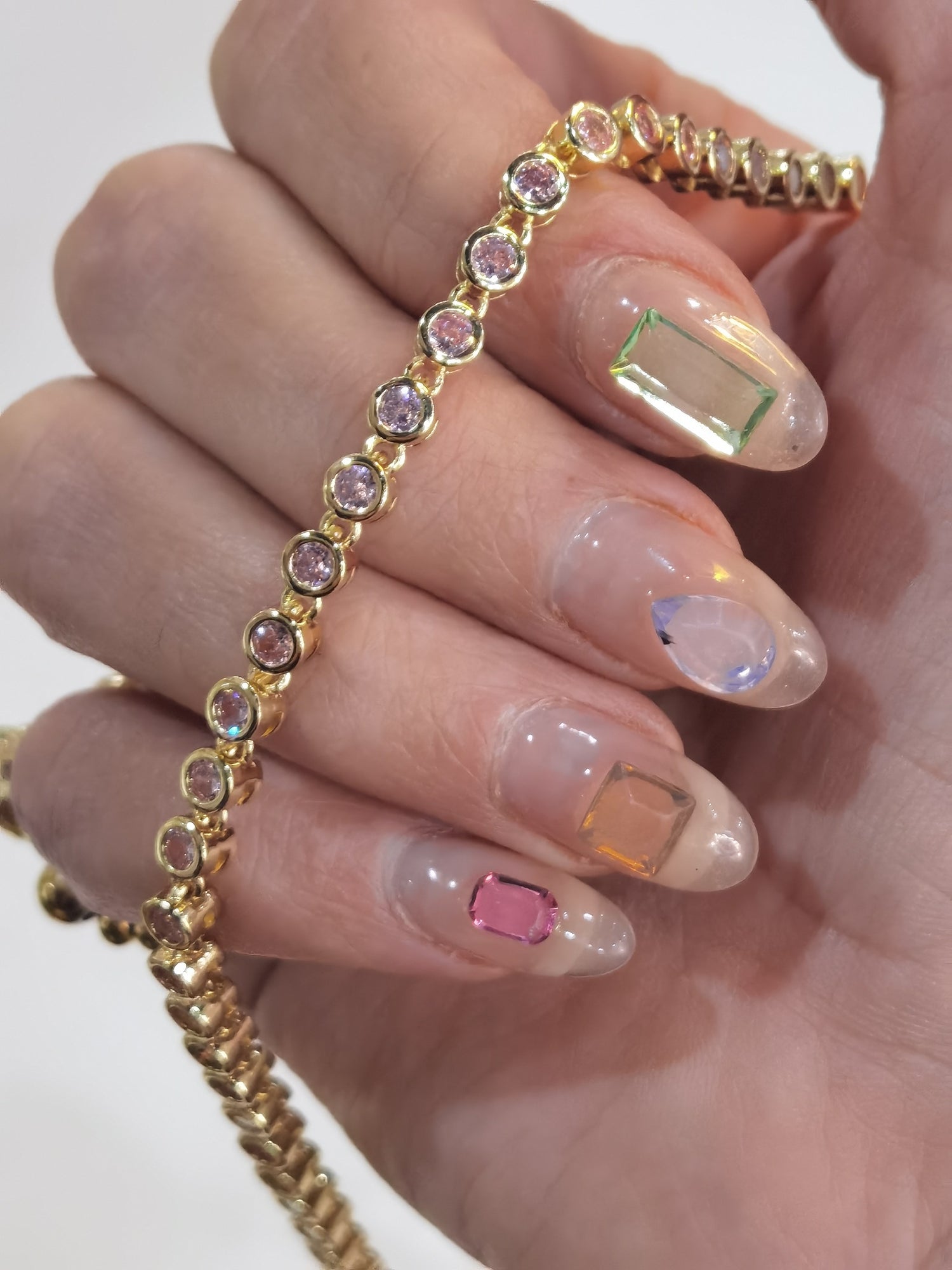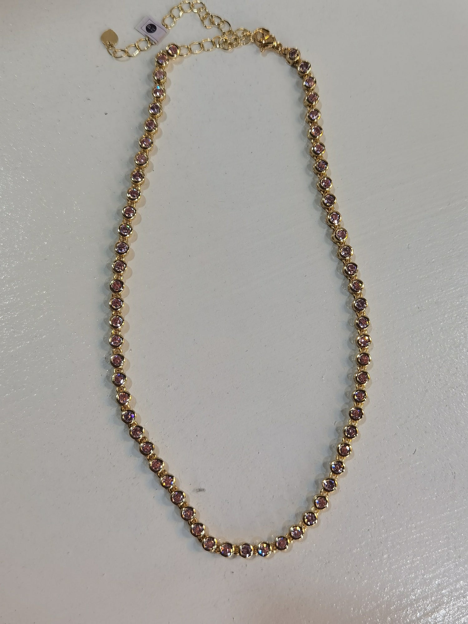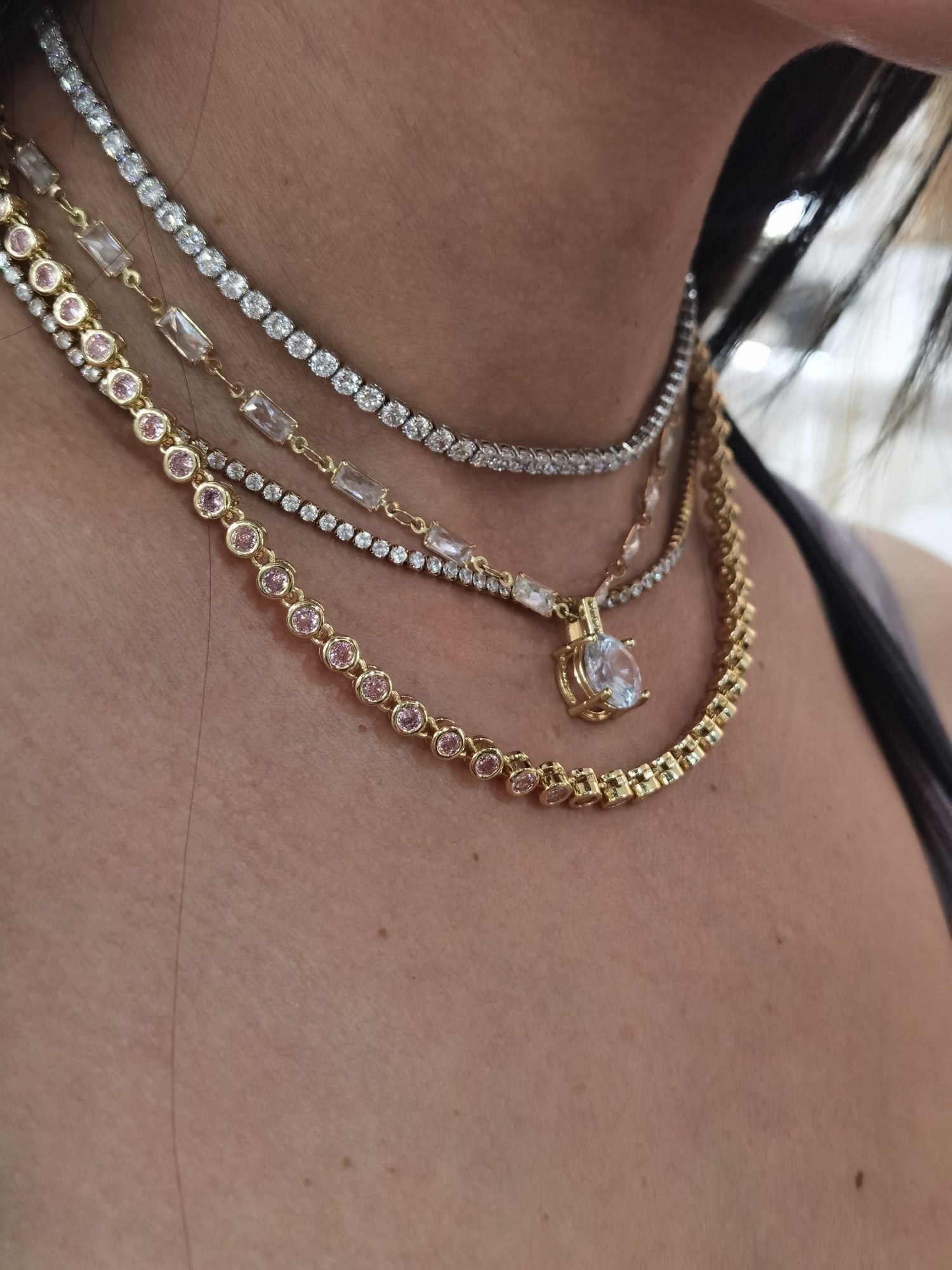 Collar de zirconias rosa bajito con base en baño de oro 18K, ideal para completar tu "stack" de collares con los brillos más femeninos del condado 💖