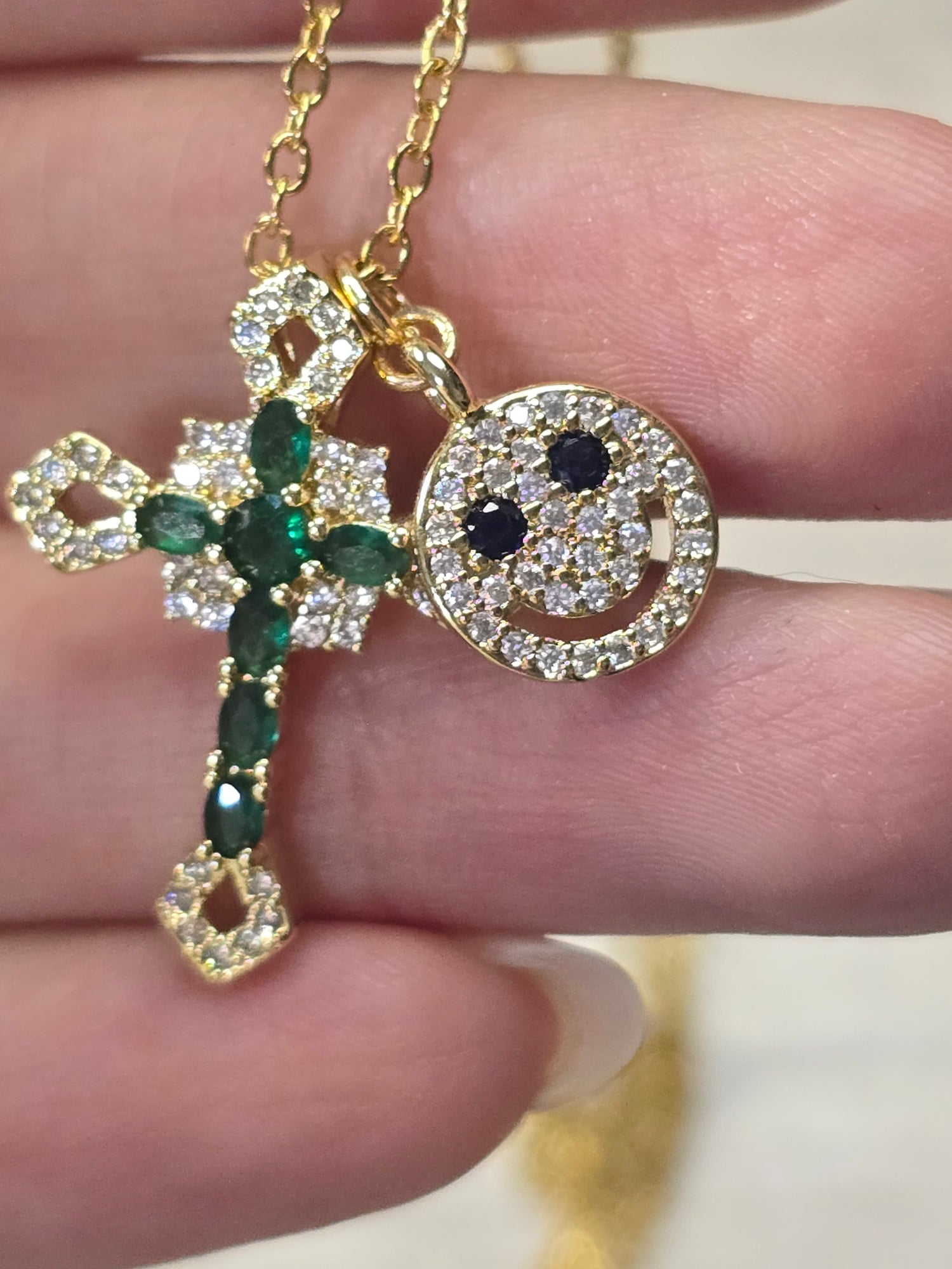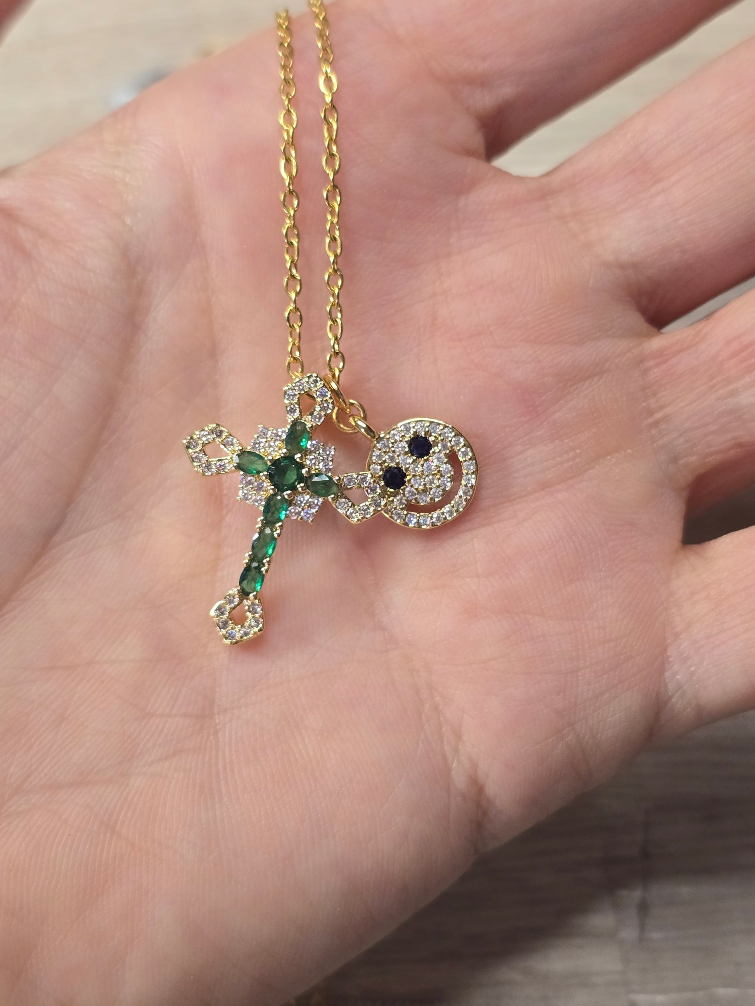 Un collar ideal para el diario, las zirconias verde esmeraldas de la cruz le dan un toque elegante y cool a la vez , es de esos colores de joyas que combinan con todo y con nada a la ves jaja (las amo !) Combinada con la carita más buena vibra del condado, para que recuerdes que te ven de arriba y quieren lo mejor para ti QUE SEAS FELIZ !